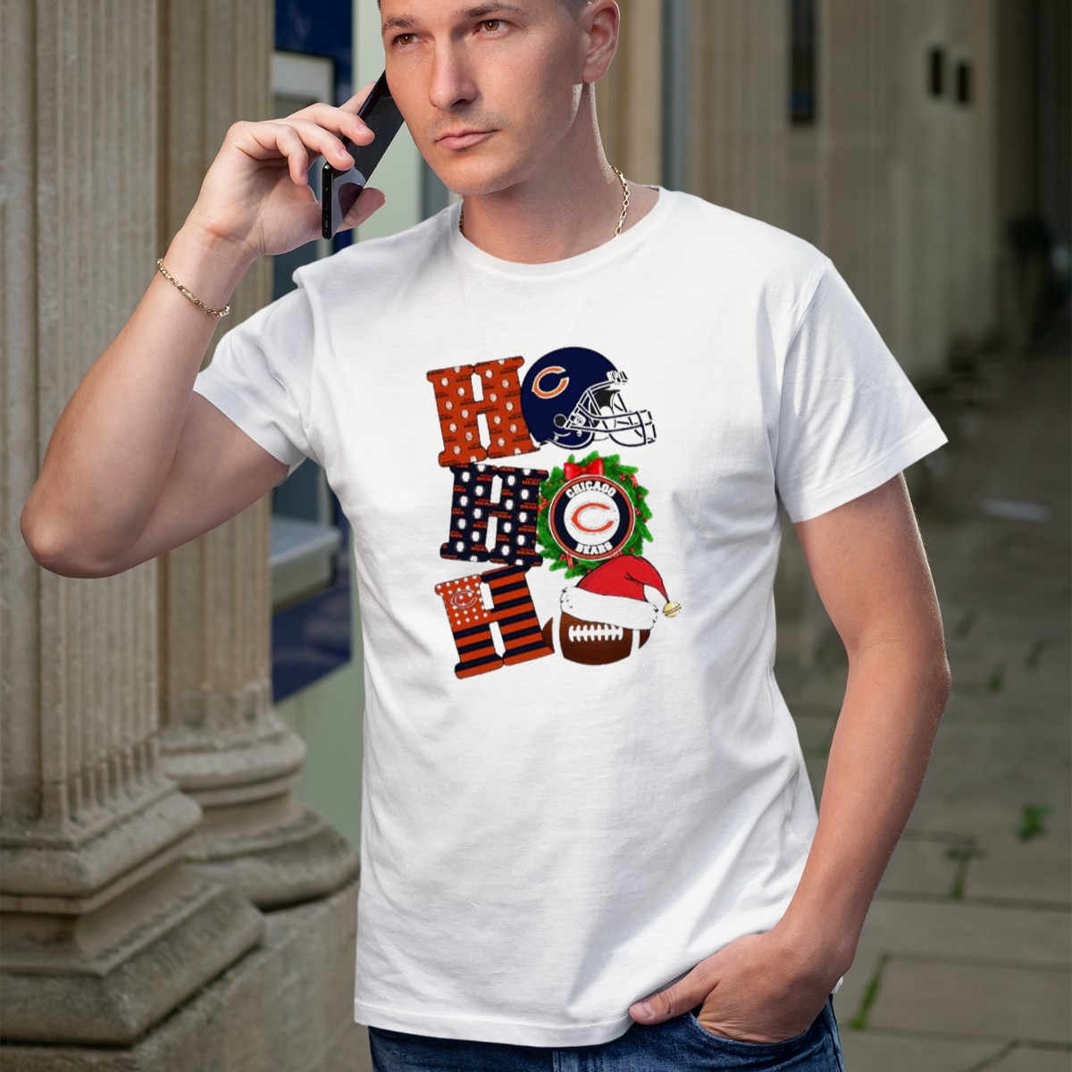 Celebrate the festive spirit and your love for football with our Chicago Bears Ho Ho Ho Merry Christmas Football Helmet Wreath Santa Hat T-Shirt! Perfect for dedicated Bears fans, this shirt combines holiday cheer with team pride, making it an ideal choice for casual wear, themed events, or daily outings during the holiday season. Made with comfort in mind, this fan-made design is printed in the USA, ensuring you stand out while supporting your team in style.
