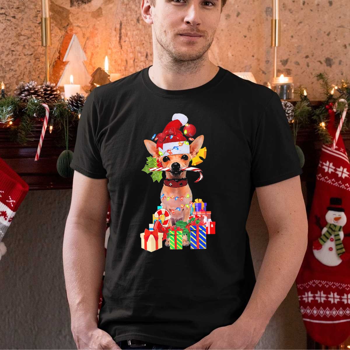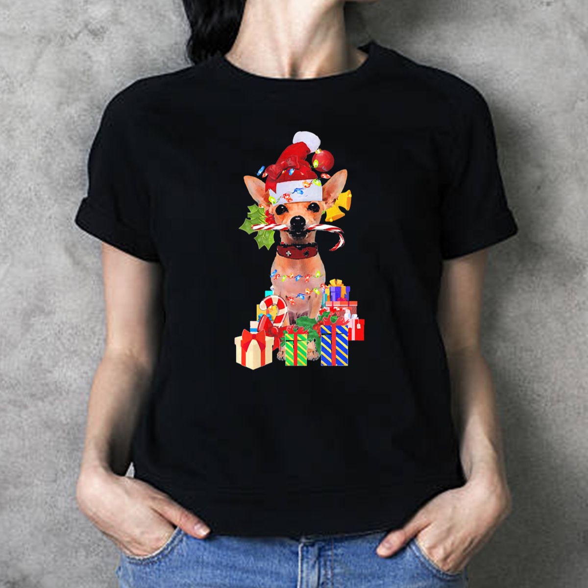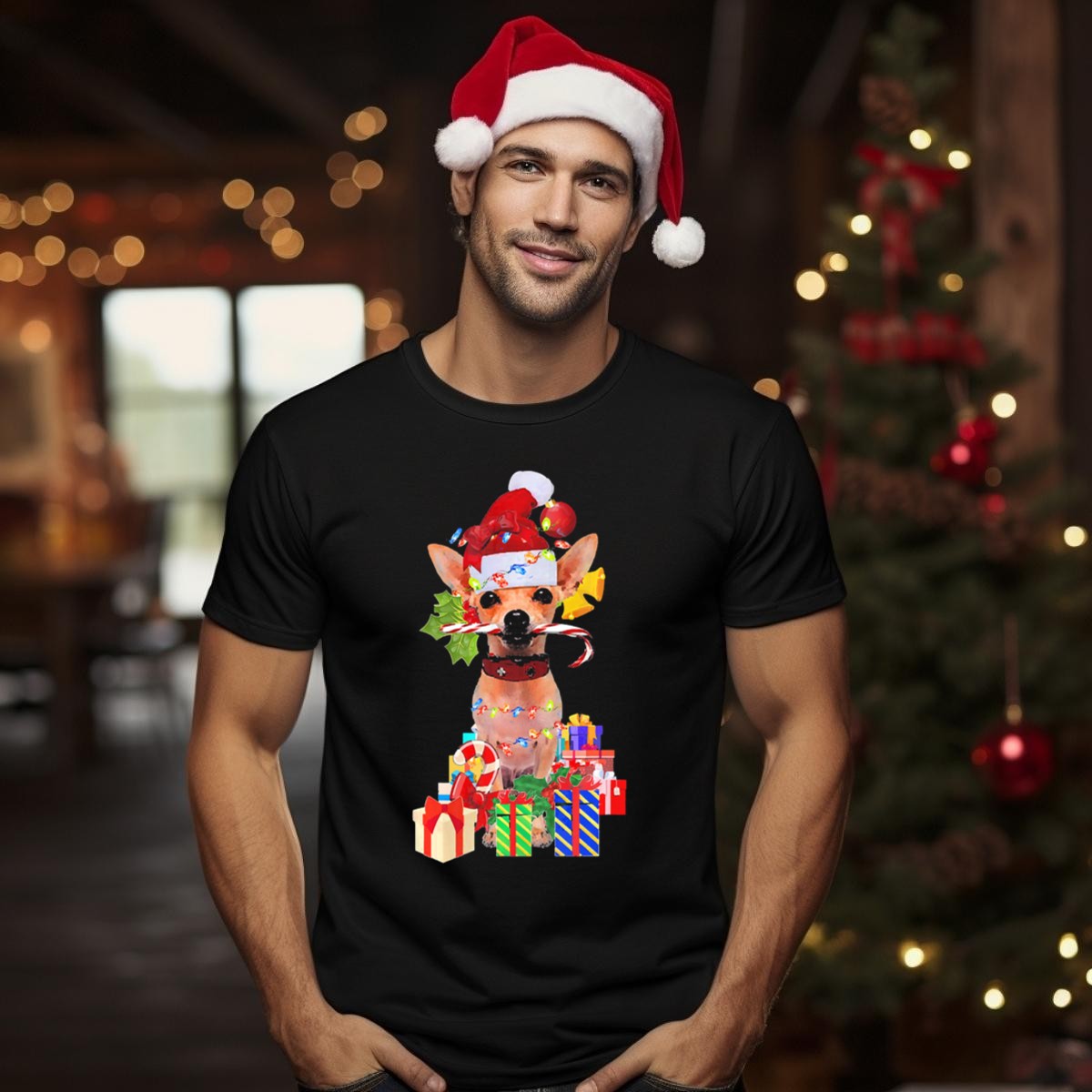 Celebrate the festive season with our cheerful Chihuahua Santa Hat Christmas Lights Candy Cane Holiday Presents T-Shirt! Perfect for dog lovers and holiday enthusiasts alike, this fun and playful design captures the spirit of Christmas with a whimsical twist. Ideal for casual wear, themed events, or simply spreading holiday cheer during daily outings, this shirt is a must-have for anyone looking to showcase their love for both the holidays and their furry friends. Made with care and printed in the USA, it’s a unique addition to your seasonal wardrobe!