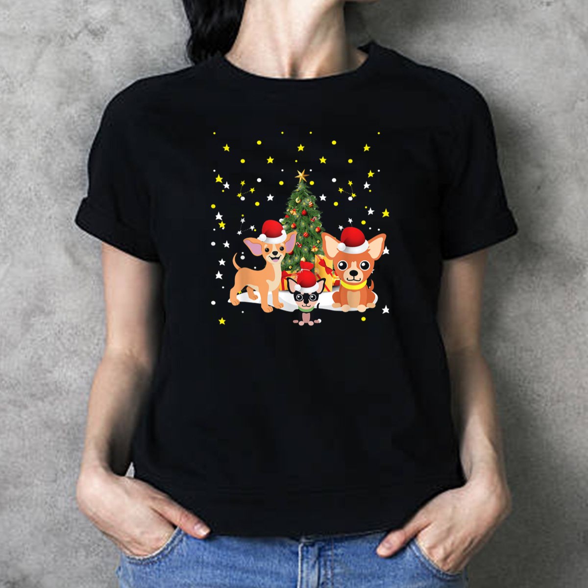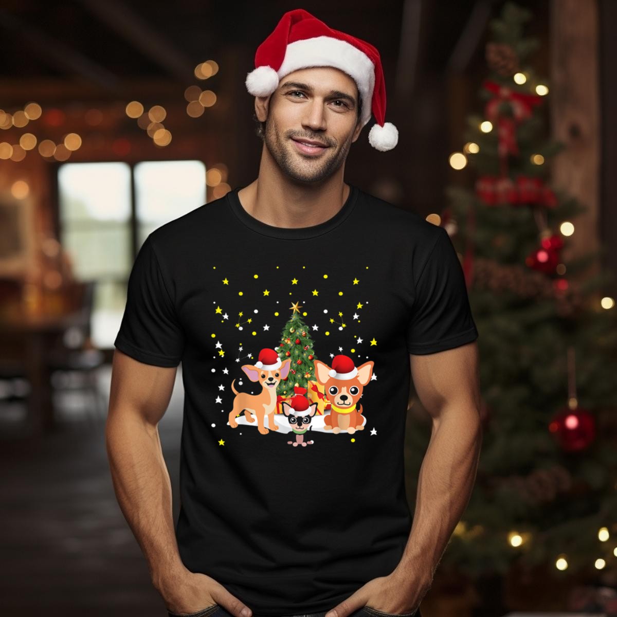 Celebrate the festive season with our adorable Chihuahua Santa Hats Christmas Tree Stars And Lights T-Shirt! Perfect for dog lovers and holiday enthusiasts alike, this charming tee captures the joy of Christmas with its playful design. Whether you’re attending a themed event, lounging around the house, or out and about during the holidays, this shirt is sure to spread cheer and bring smiles. Made for comfort and style, it’s a must-have addition to your casual wear collection, ensuring you stand out at all your seasonal gatherings!