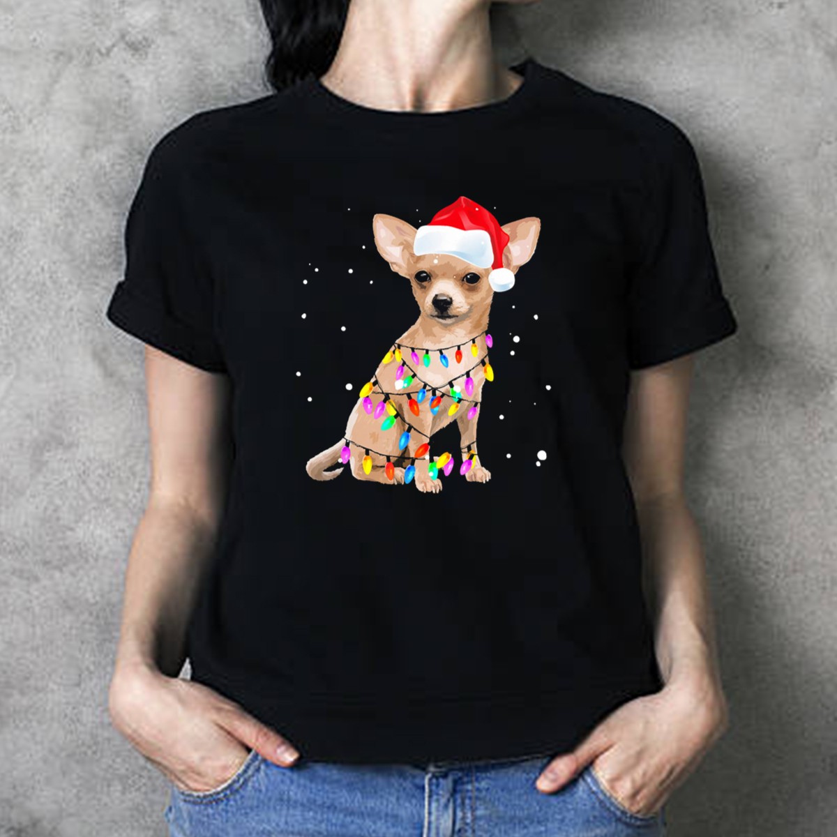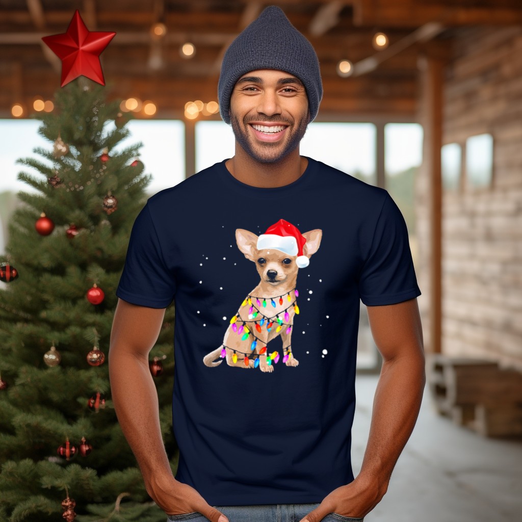 Celebrate the festive spirit with our adorable Chihuahua Wrapped In Christmas Lights Wearing Santa Hat T-Shirt! Perfect for dog lovers and holiday enthusiasts alike, this playful design adds a cheerful touch to your casual wear for themed events, family gatherings, or simply running errands during the holiday season. Made with love and printed in the USA, this fan-made shirt is a unique way to showcase your love for your furry friends and the joy of the holidays!