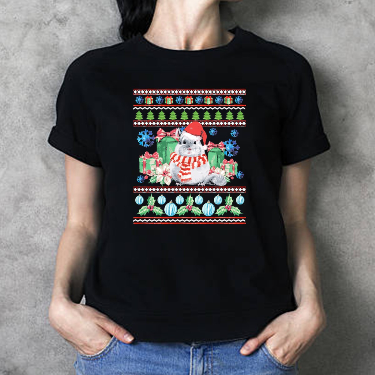 Chinchilla Ugly Christmas Funny Pet Santa Hat Presents Snowflakes T-Shirt