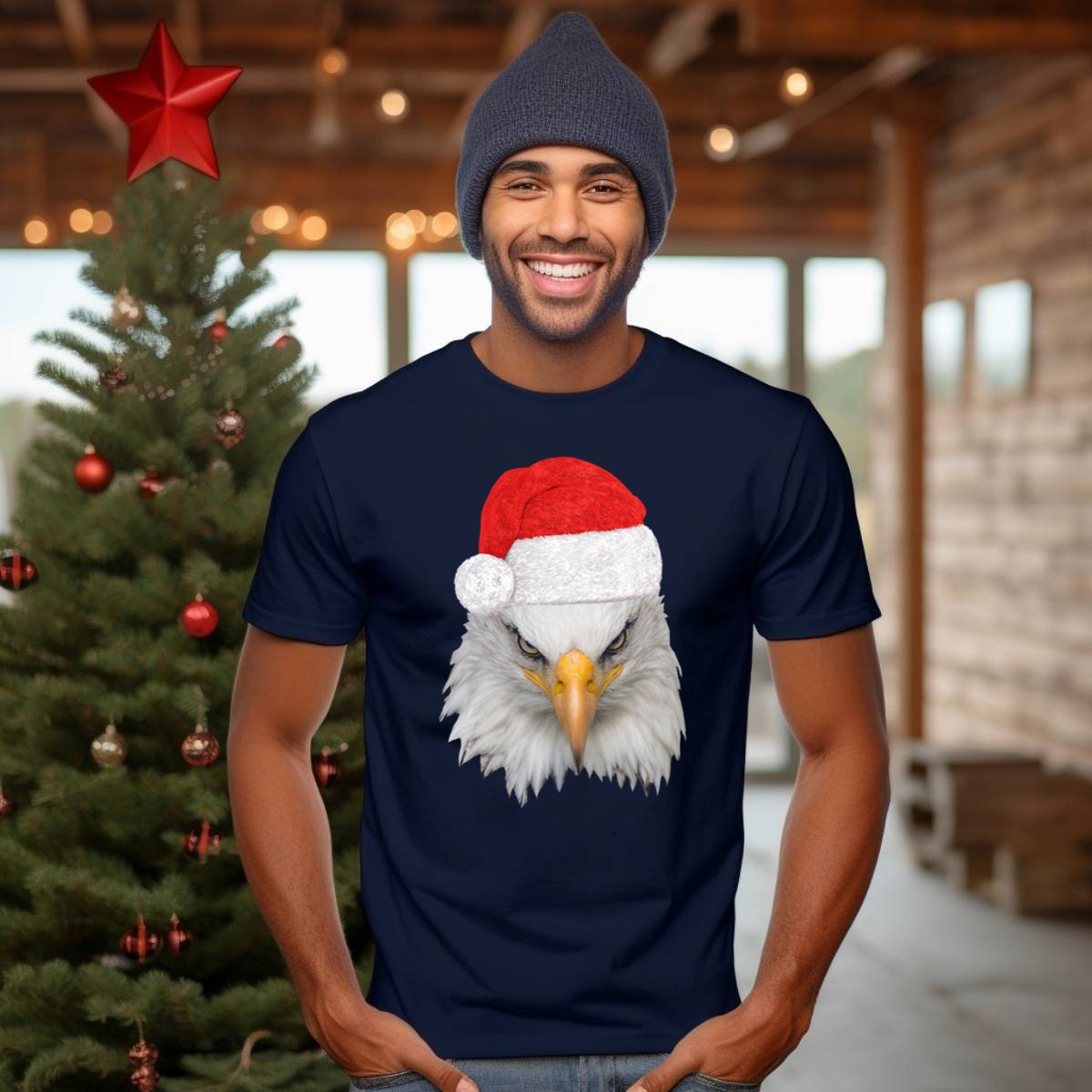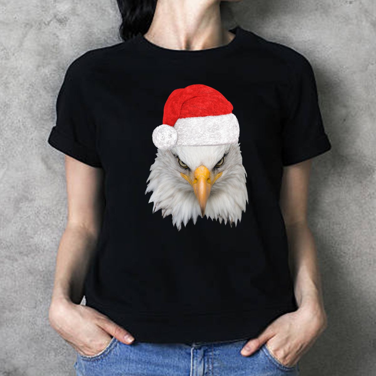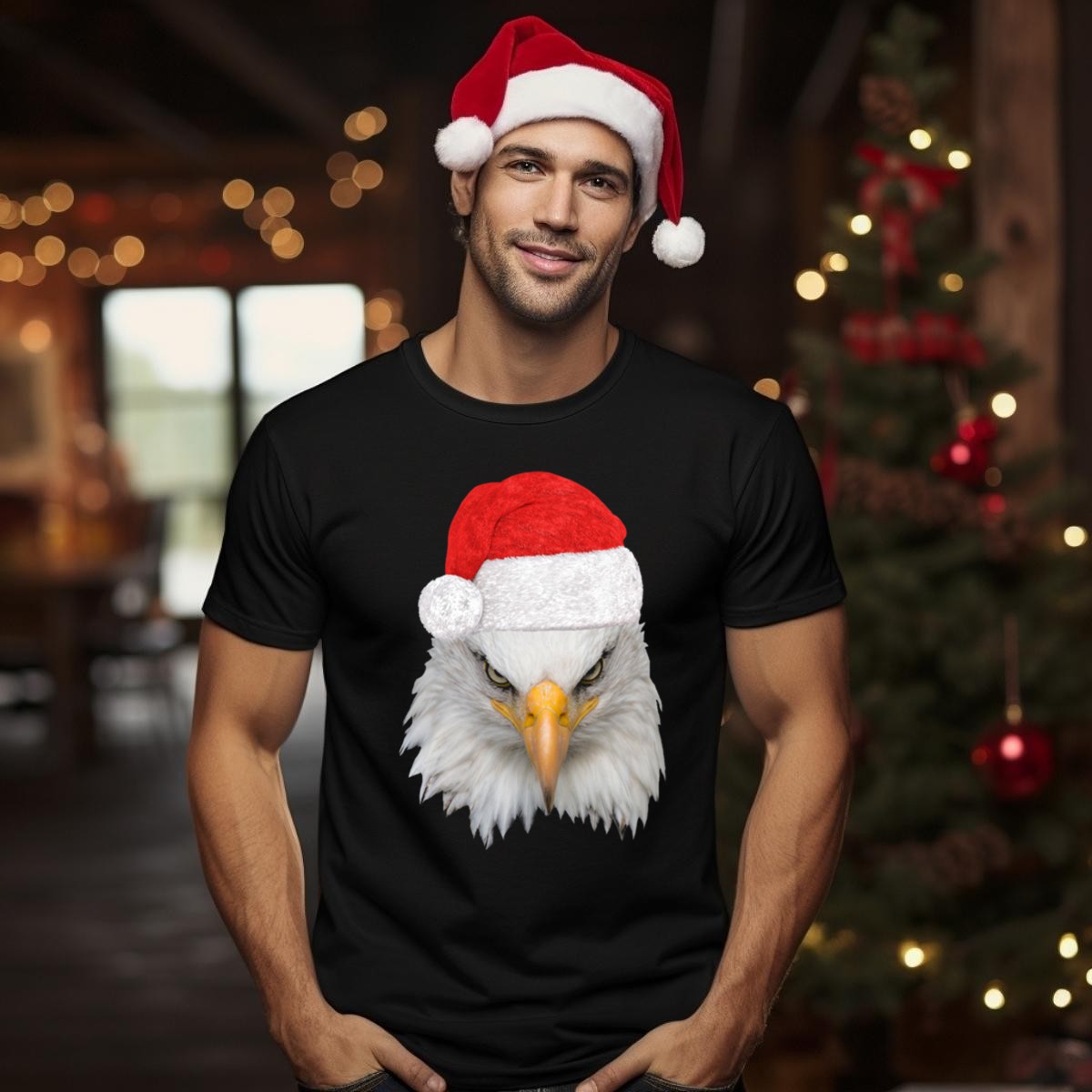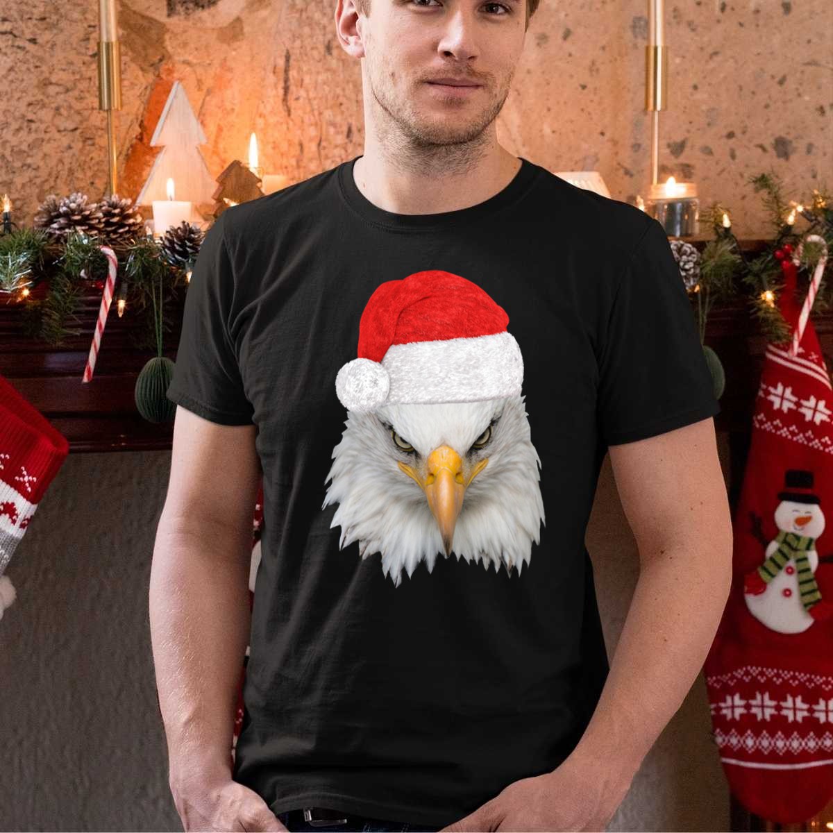 Celebrate the holiday season with a touch of patriotism in our Christmas Bald Eagle With Santa Hat T-Shirt! Perfect for those who love to showcase their American spirit, this shirt is ideal for family gatherings, themed events, or just a casual day out. Made for comfort and style, the eye-catching design features a bold bald eagle donning a festive Santa hat, making it a unique addition to your wardrobe that stands out during the festive season.