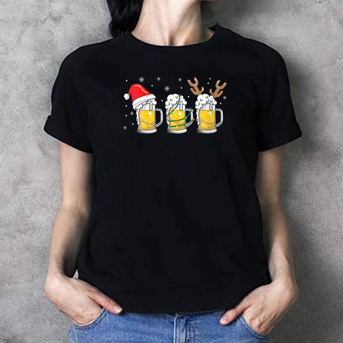 Christmas Beer Reinbeer Mug Trio Santa Hat Reindeer Antlers Snowflakes T Shirt