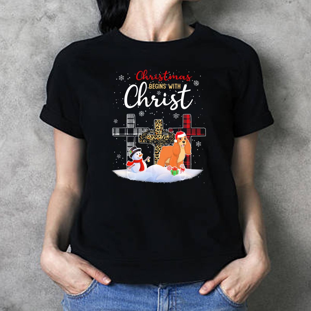 Celebrate the joyful spirit of the holiday season with our Christmas Begins With Christ Cocker Spaniel Dog Snowman T-Shirt! This charming design is perfect for dog lovers and families alike, bringing a festive touch to your casual wear. Ideal for themed events, gatherings, or simply spreading cheer during daily activities, this shirt is a delightful way to showcase your love for both Christ and your furry friends. Made with care in the USA, this fan-made design ensures you stand out while embracing the warmth of the season.