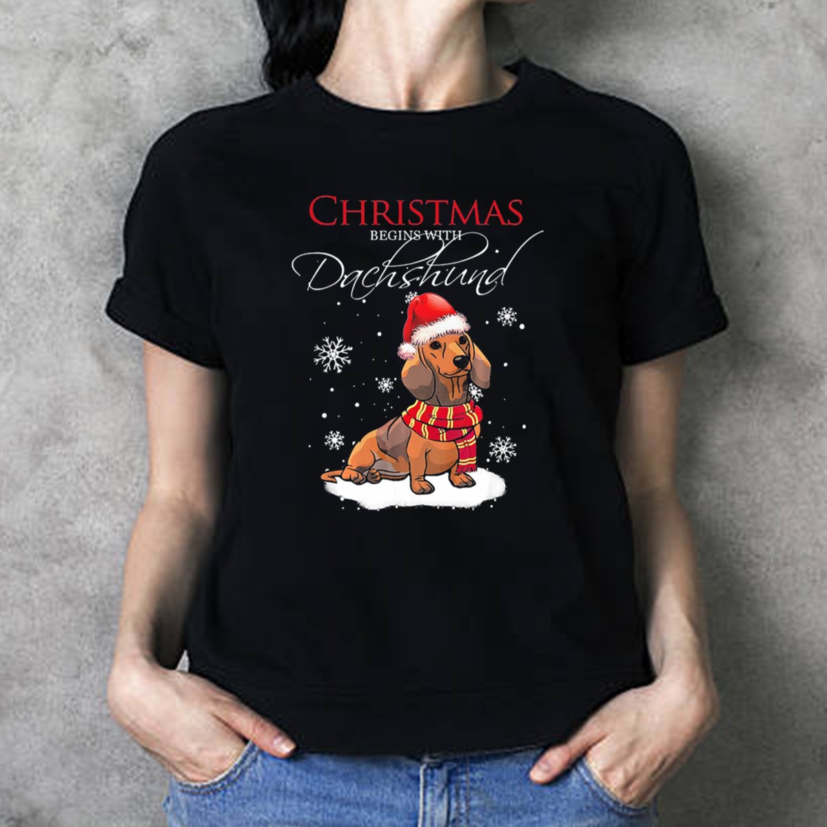 Get into the festive spirit with our Christmas Begins With Dachshund Santa Hat Scarf Snowflakes T-Shirt! Perfect for dog lovers and holiday enthusiasts alike, this charming shirt features an adorable dachshund dressed in a Santa hat and scarf, surrounded by playful snowflakes. Ideal for casual wear, themed events, or daily festivities, this unique design adds a touch of whimsy to your winter wardrobe, making it a must-have for celebrating the season in style.