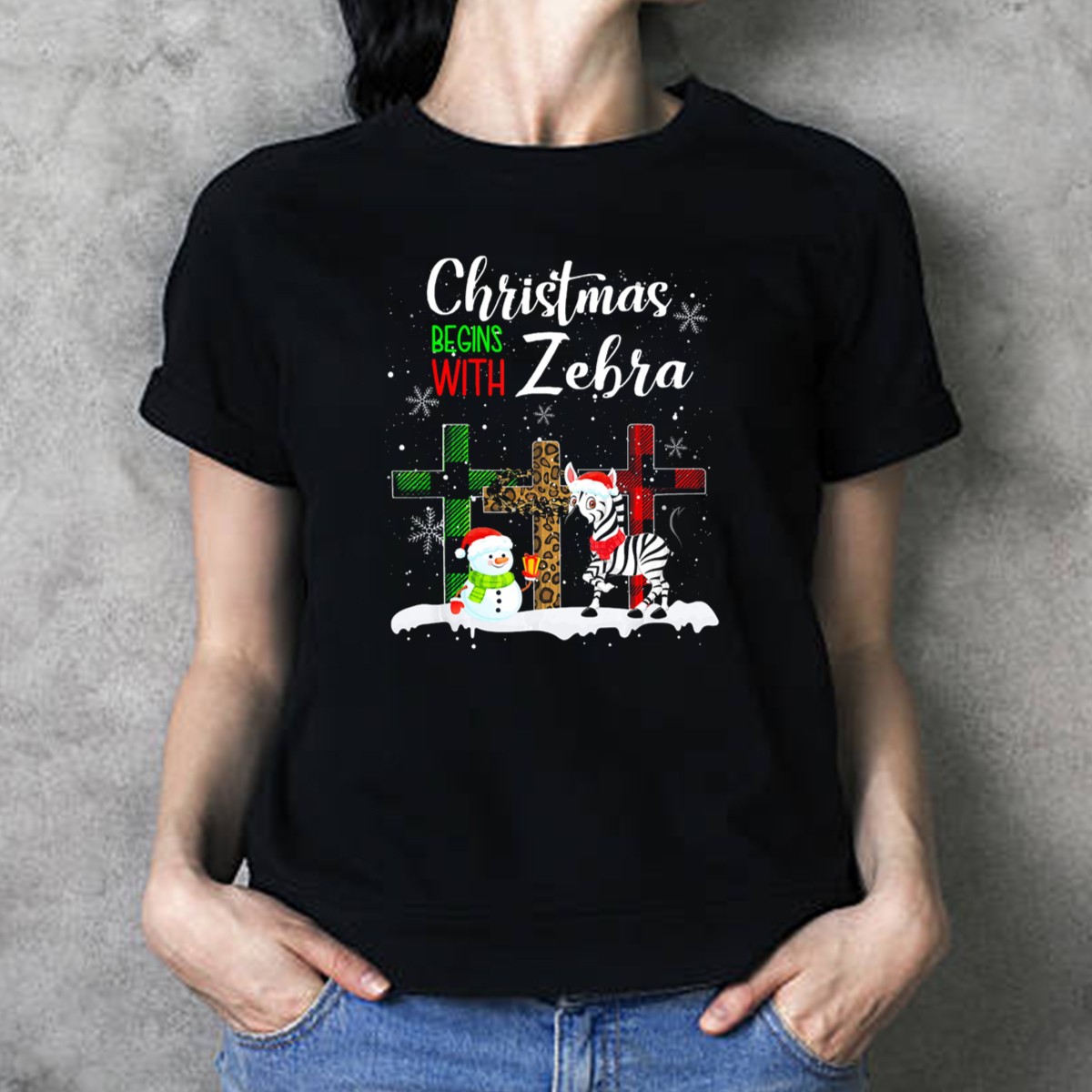 Be the first to review “Christmas Begins With Zebra Snowman Santa Hat Crosses T-Shirt”