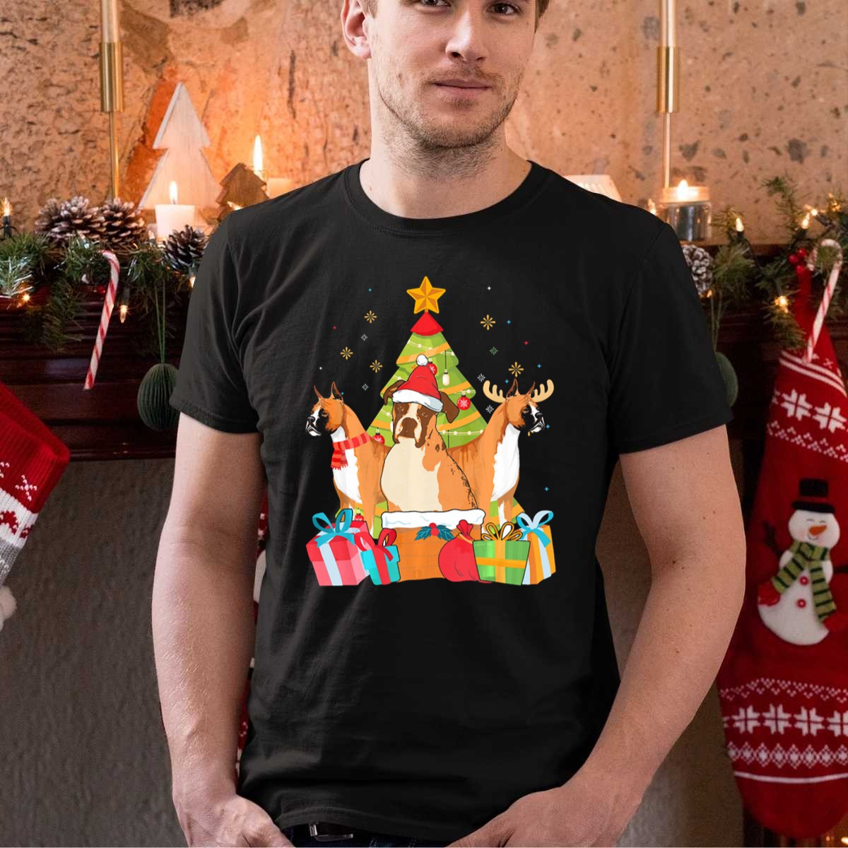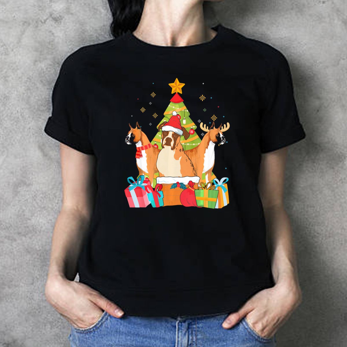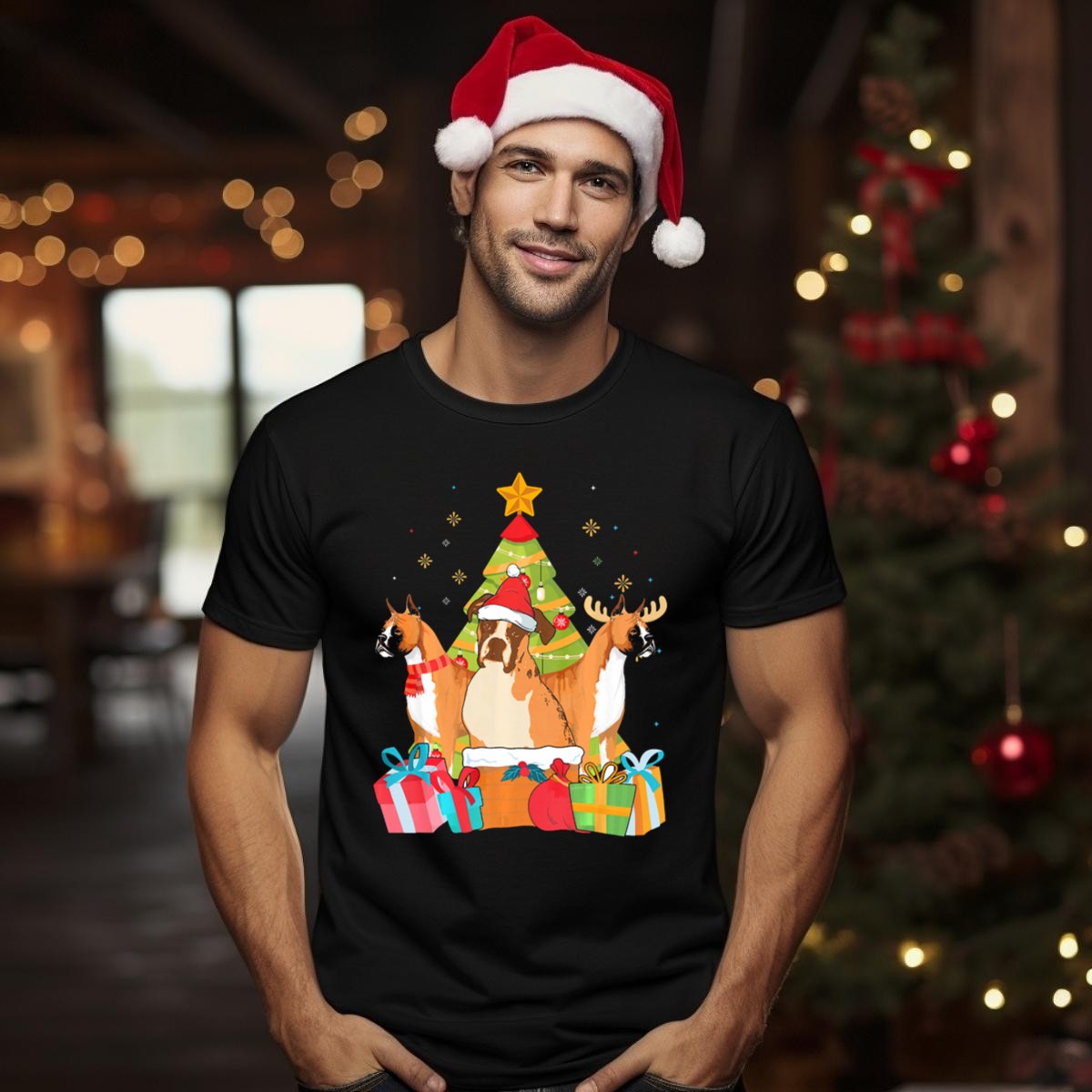 Celebrate the holiday spirit with our charming Christmas Boxer Dogs T-shirt! Perfect for dog lovers and festive enthusiasts alike, this fan-made design features adorable boxers wearing Santa hats and reindeer antlers, all set against a whimsical backdrop of a Christmas tree. Ideal for casual wear, themed events, or simply spreading cheer during the festive season, this shirt brings a unique touch of joy to your wardrobe, making it a delightful choice for all your holiday gatherings.