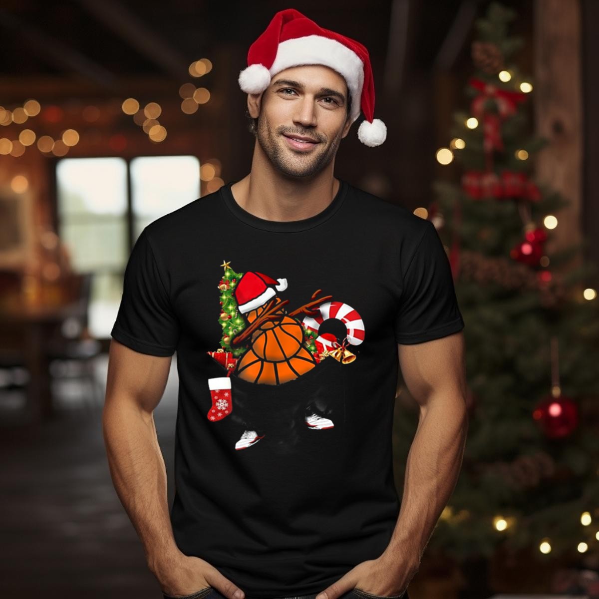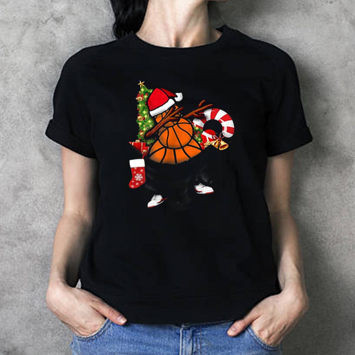 Christmas Dabbing Basketball Snowman In Pocket With Candy Cane And Santa Hat T Shirt