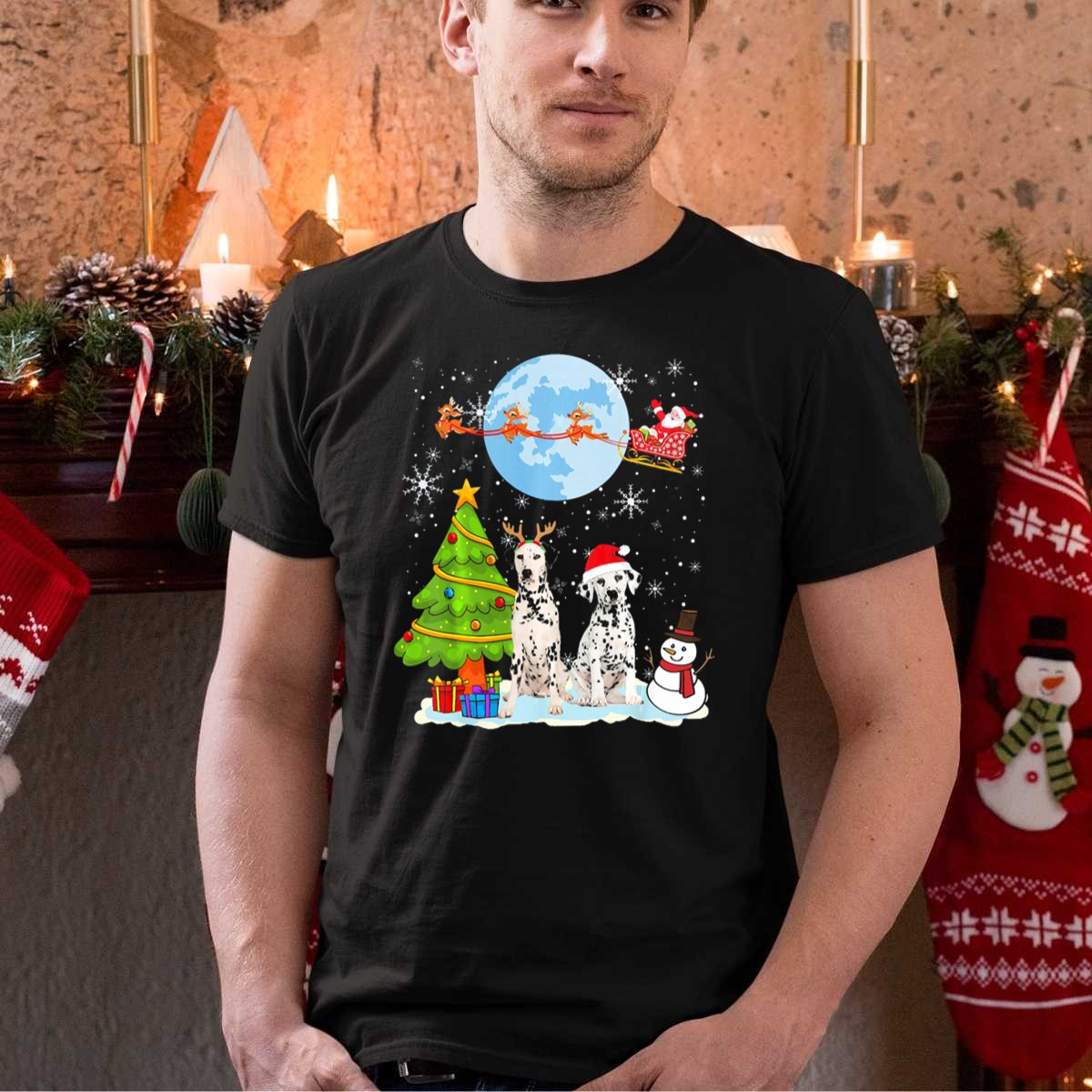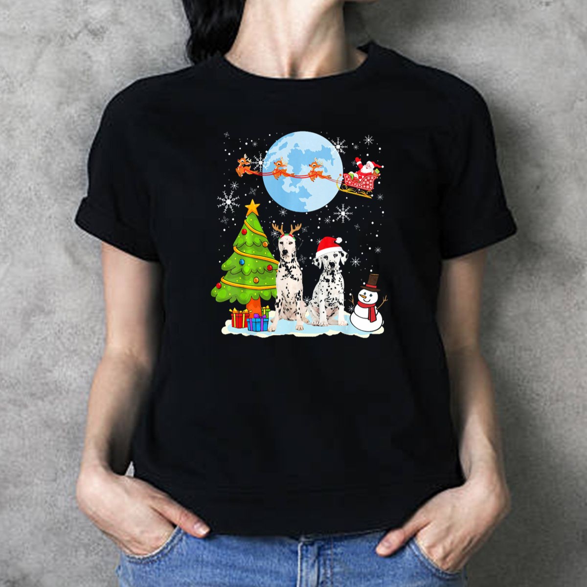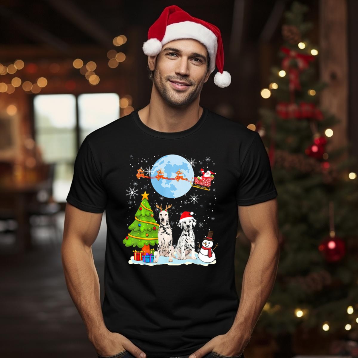 Celebrate the holiday season in style with our Christmas Dalmatian Moon Santa Tree Reindeer Snowman T-Shirt! This fan-made design features a delightful blend of festive elements that captures the joy and whimsy of Christmas. Perfect for dog lovers and holiday enthusiasts alike, this shirt is ideal for casual wear, themed events, or simply spreading cheer during your daily activities. Made and printed in the USA, this unique tee is a must-have for anyone looking to showcase their festive spirit!