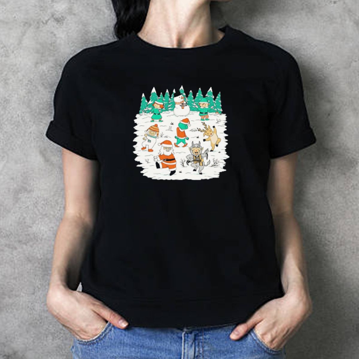 Christmas Dance Party With Santa Krampus Grinch Snowman And Reindeer In Winter Forest T-Shirt