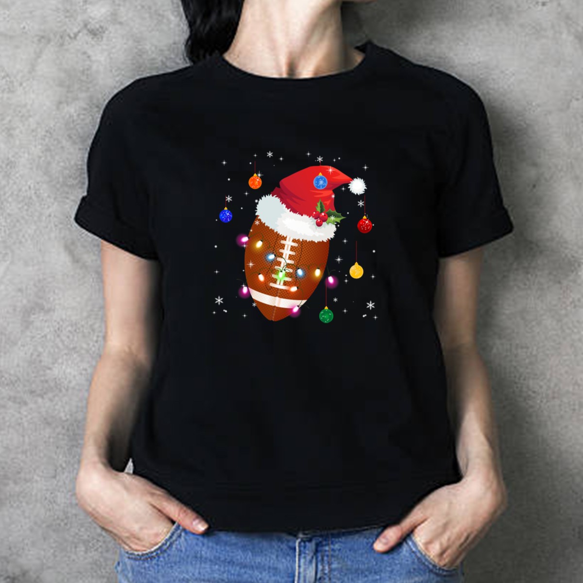 Get ready to spread some holiday cheer with our Christmas Football Santa Hat Ornaments Lights T-Shirt! Perfect for football fans and holiday lovers alike, this festive tee is ideal for casual wear, themed events, or just showing off your spirit during the holiday season. With a fun and unique fan-made design printed right here in the USA, you’ll be sure to stand out at any gathering!