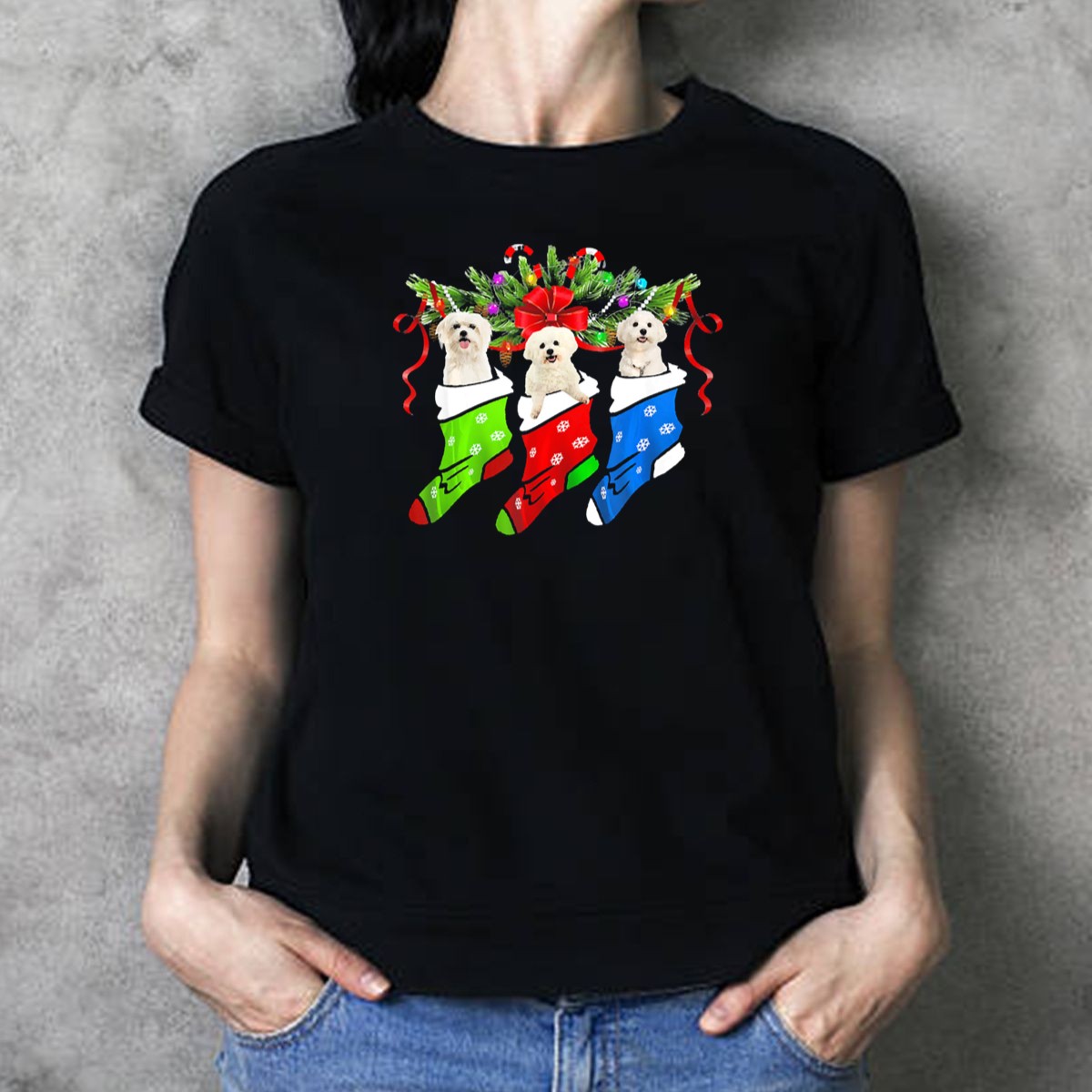 Celebrate the festive season in style with our Christmas Funny Three Maltese Dogs In Holiday Stockings T-Shirt! Perfect for dog lovers and holiday enthusiasts alike, this playful design showcases three adorable Maltese pups nestled in colorful stockings, making it an ideal choice for casual wear during holiday gatherings, themed events, or simply spreading cheer in your daily life. Made with love and printed in the USA, this fan-made design is sure to bring smiles to everyone around you.