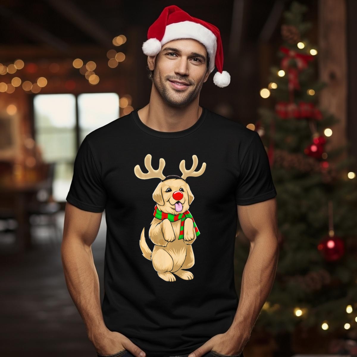 Celebrate the holiday season in style with our Christmas Golden Retriever T-Shirt! Perfect for dog lovers and anyone who wants to spread festive cheer, this fan-made design features an adorable golden retriever sporting reindeer antlers and a bright red nose. Ideal for casual wear, themed events, or simply lounging around during the holidays, this shirt is a delightful addition to your all-season wardrobe.