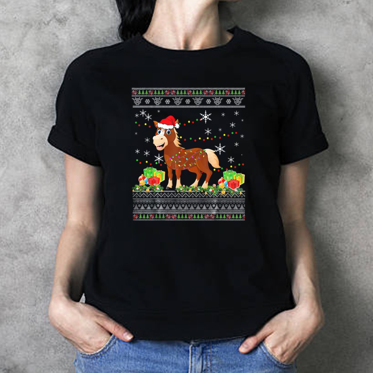 Be the first to review “Christmas Horse Santa Hat Lights Snowflakes Presents T-Shirt”