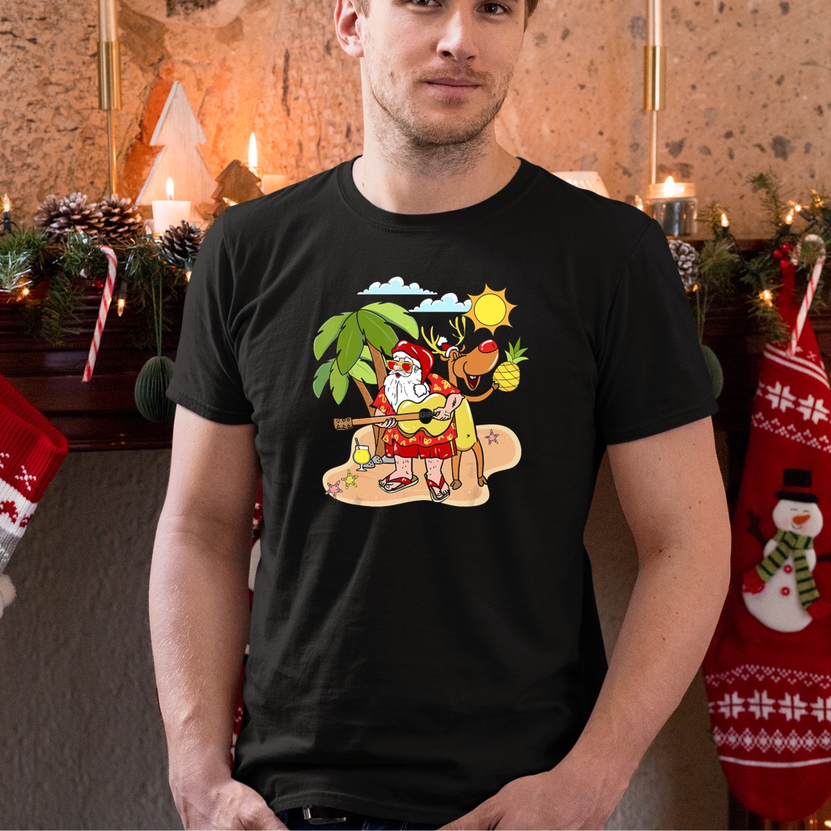 Celebrate the joy of summer and the spirit of Christmas with our Christmas In July T-Shirt, featuring a whimsical design that showcases a Santa, palm tree, deer, and guitar amidst a tropical beach scene. Perfect for anyone who loves to blend holiday cheer with laid-back summer vibes, this shirt is an excellent choice for casual wear, themed events, or simply enjoying a sunny day. Made with a fan-made design printed in the USA, it stands out as a unique addition to your wardrobe.