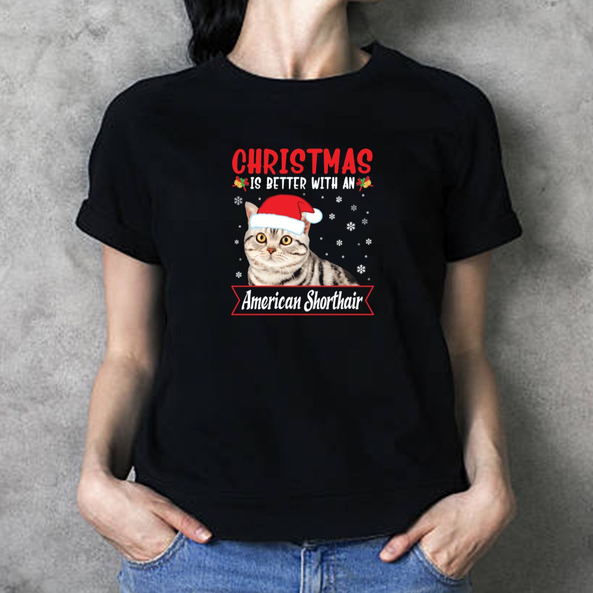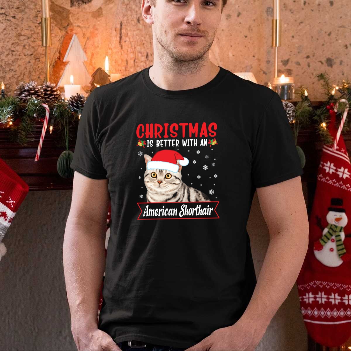 Christmas Is Better With An American Shorthair Cat Wearing Santa Hat Among Snowflakes T Shirt