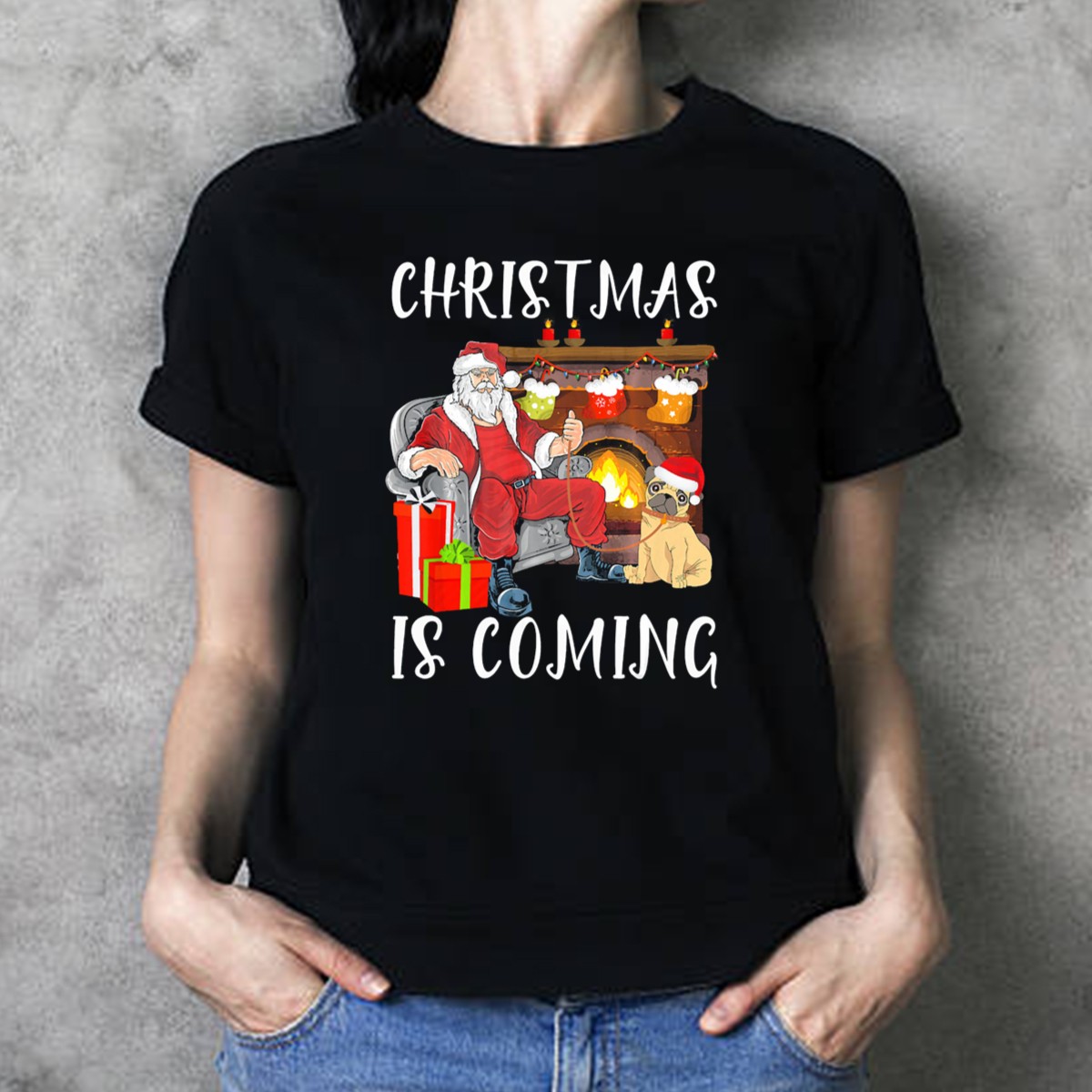 Be the first to review “Christmas Is Coming Santa Claus By Fireplace With Dog And Gifts T-Shirt”