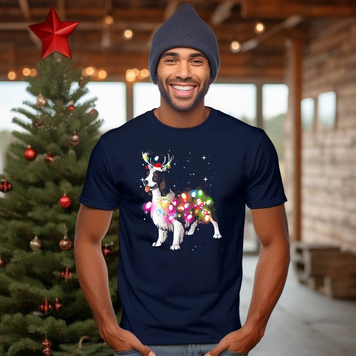 Add a festive touch to your wardrobe with our Christmas Lights English Springer Spaniel T-Shirt, perfect for dog lovers and holiday enthusiasts alike! Featuring an adorable graphic of a Springer Spaniel adorned with reindeer antlers and a Santa hat, this shirt is ideal for casual wear, themed events, or simply spreading holiday cheer. Made for comfort and style, it’s the perfect way to showcase your love for your furry friend during the most wonderful time of the year!