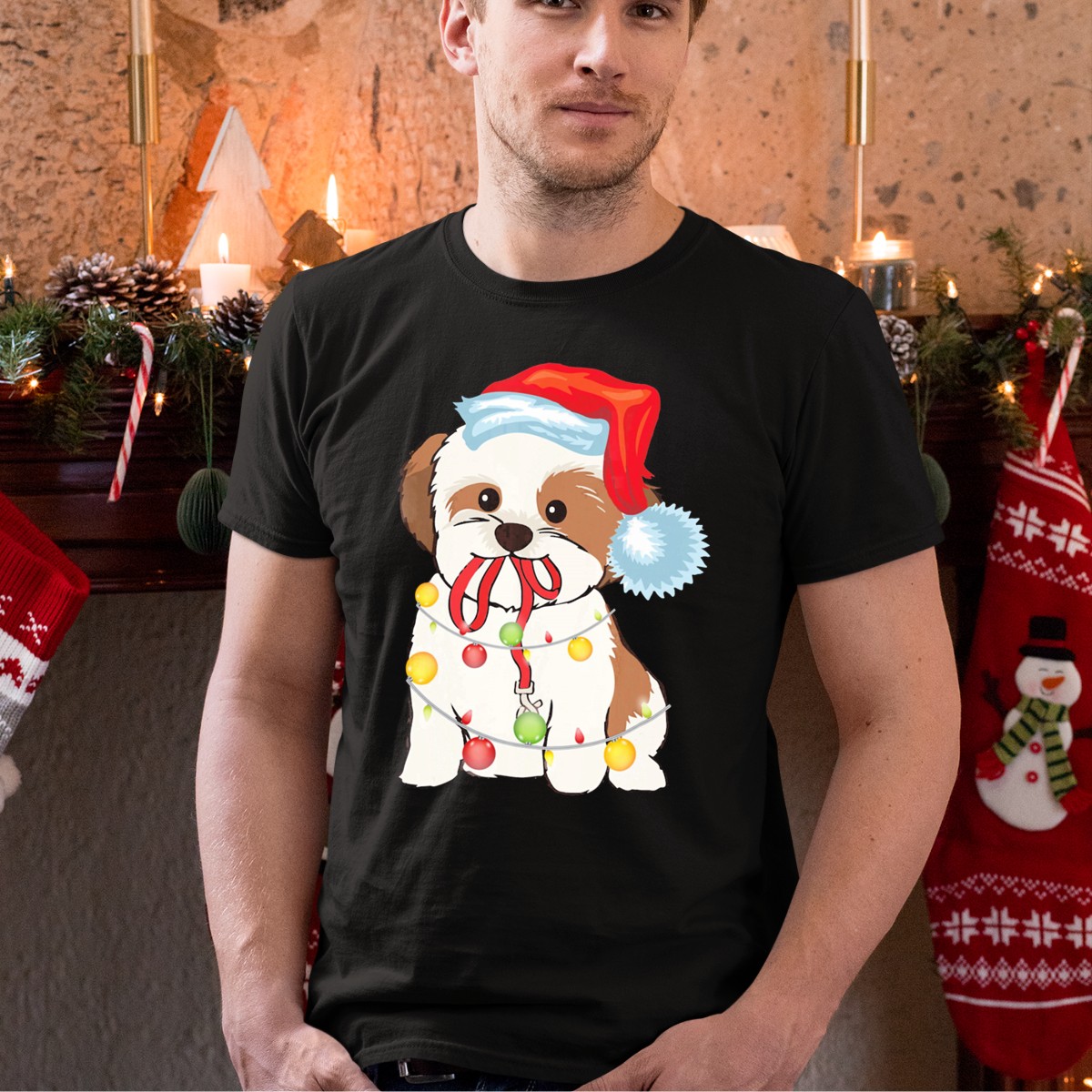 Christmas Lights Shih Tzu With Santa Hat And Festive T-Shirt