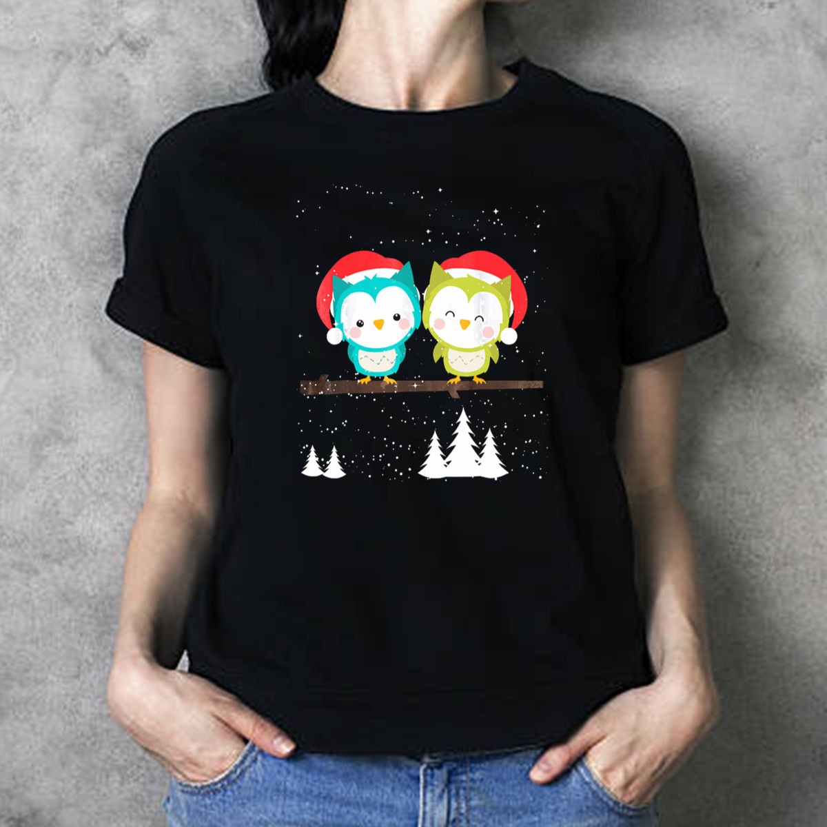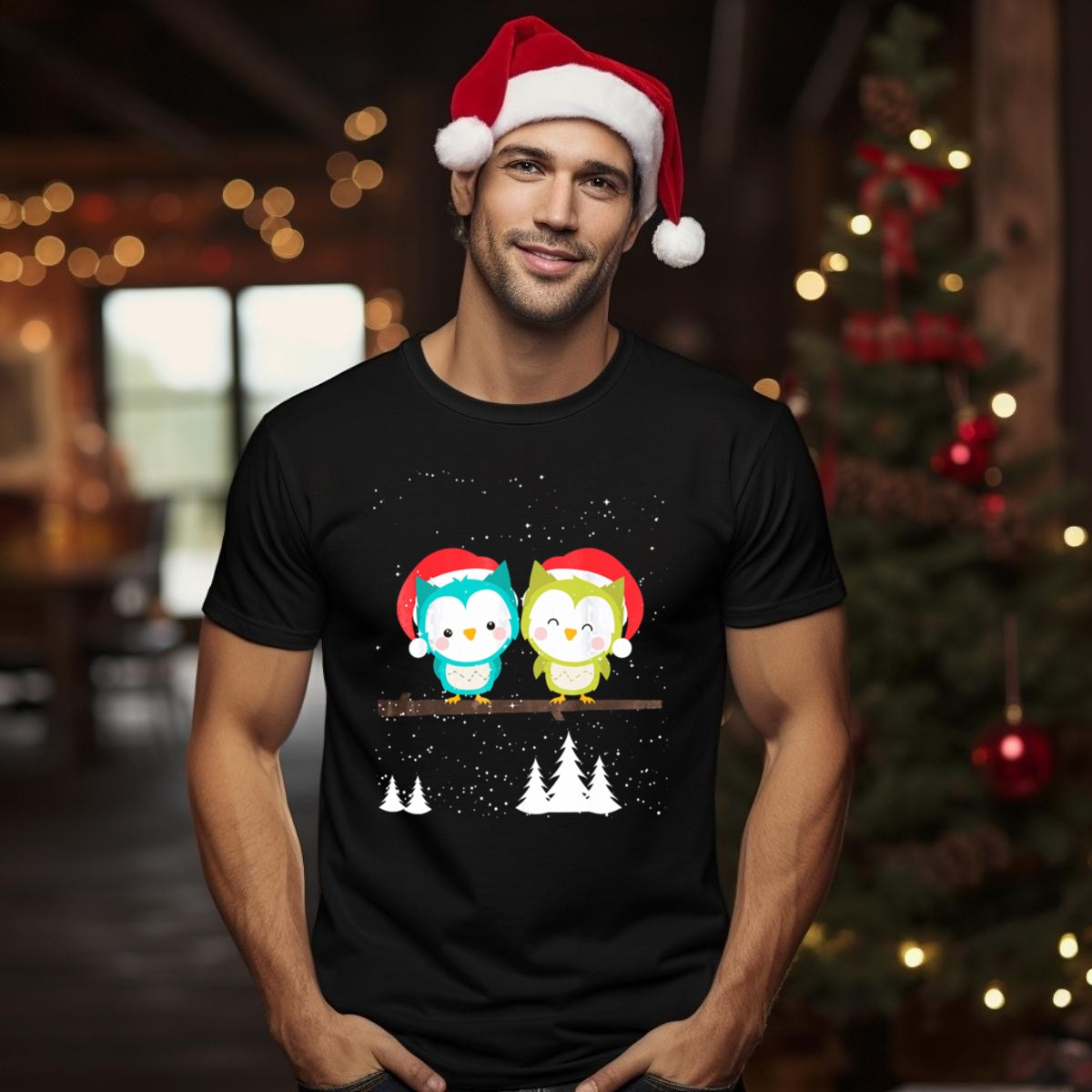 Spread holiday cheer with our Christmas Owl T-Shirt, featuring an adorable design of owls wearing Santa hats amidst winter trees. Perfect for owl lovers and anyone looking to add a bit of festive flair to their wardrobe, this shirt is ideal for casual gatherings, themed events, or daily wear during the holiday season. Made with a fan-made design printed in the USA, it combines comfort and style to celebrate the joys of winter.
