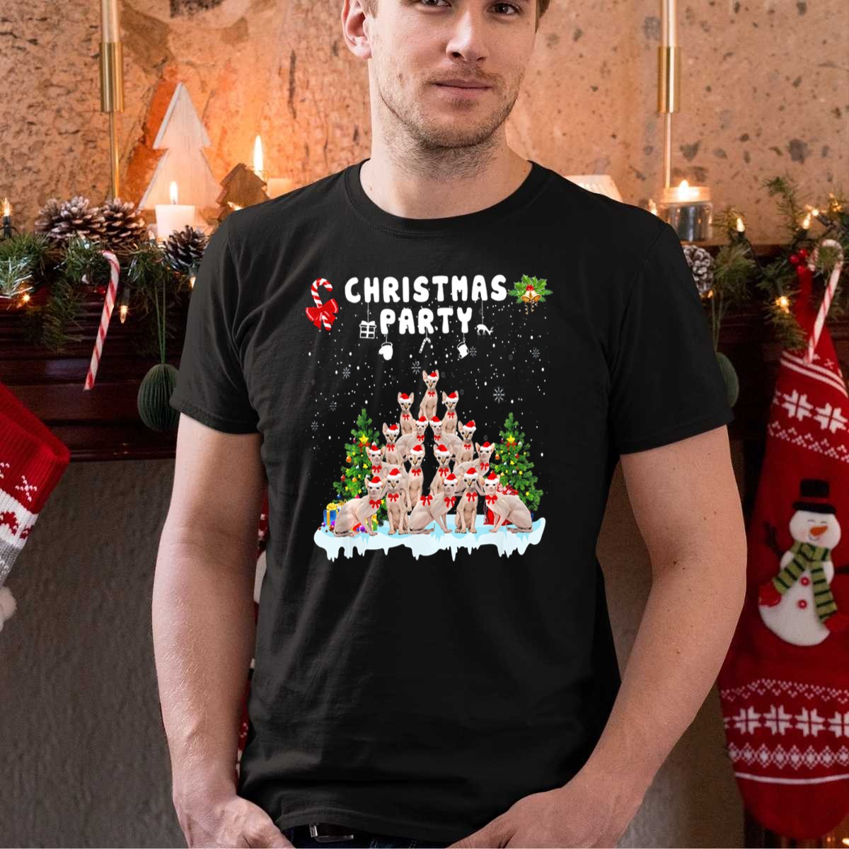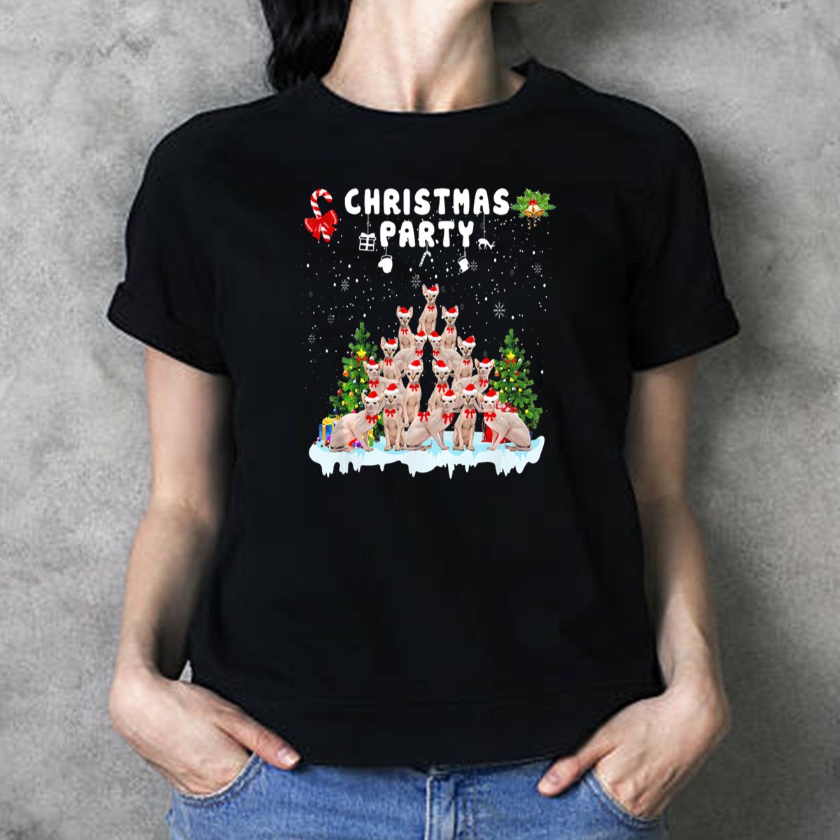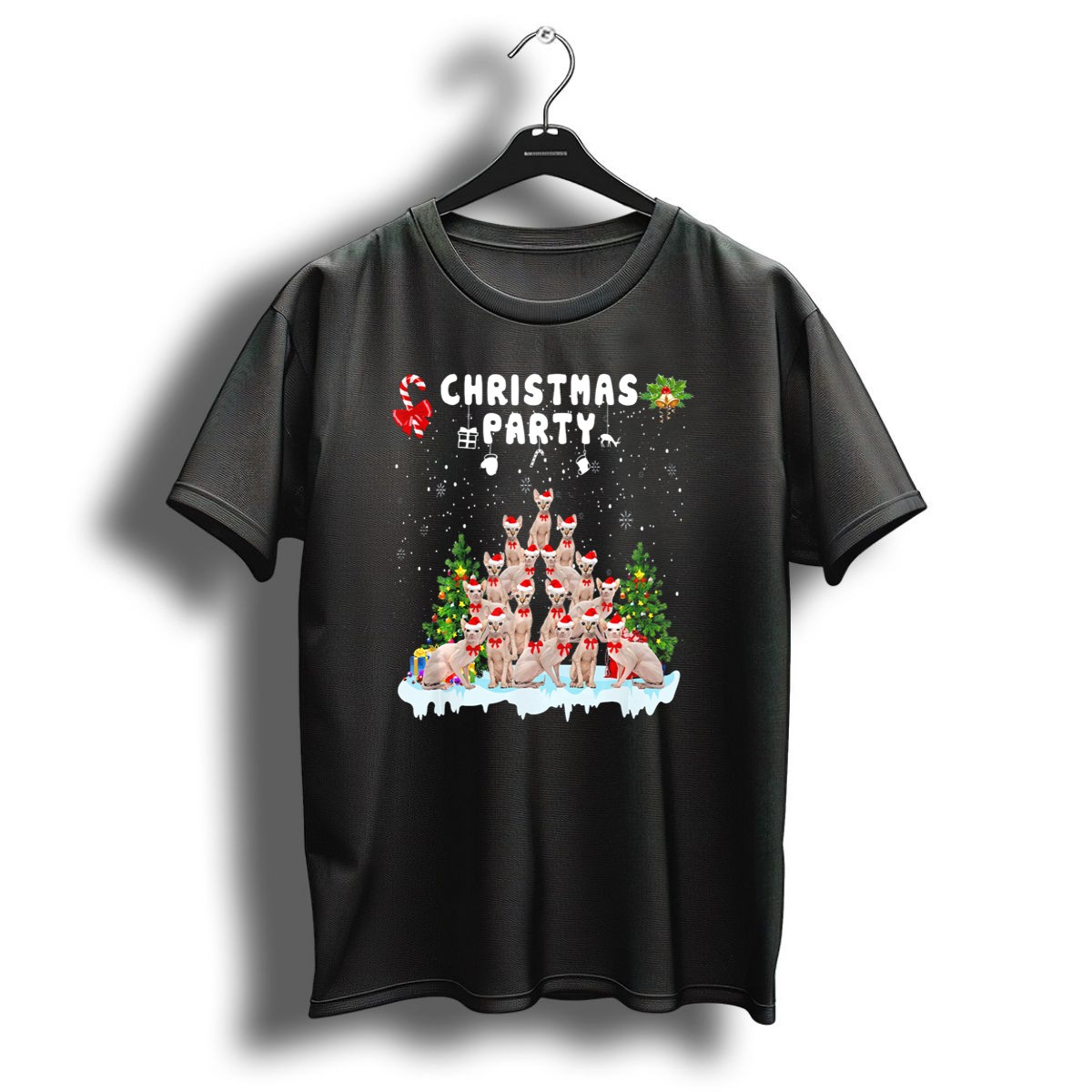 Get ready to spread some holiday cheer with our Christmas Party Funny Sphynx Cat T-Shirt! Perfect for cat lovers and those who want to add a touch of humor to their festive wardrobe, this fun tee is ideal for casual gatherings, themed events, or simply lounging around during the holiday season. Featuring a fan-made design printed in the USA, this shirt is sure to be a conversation starter at any Christmas party!
