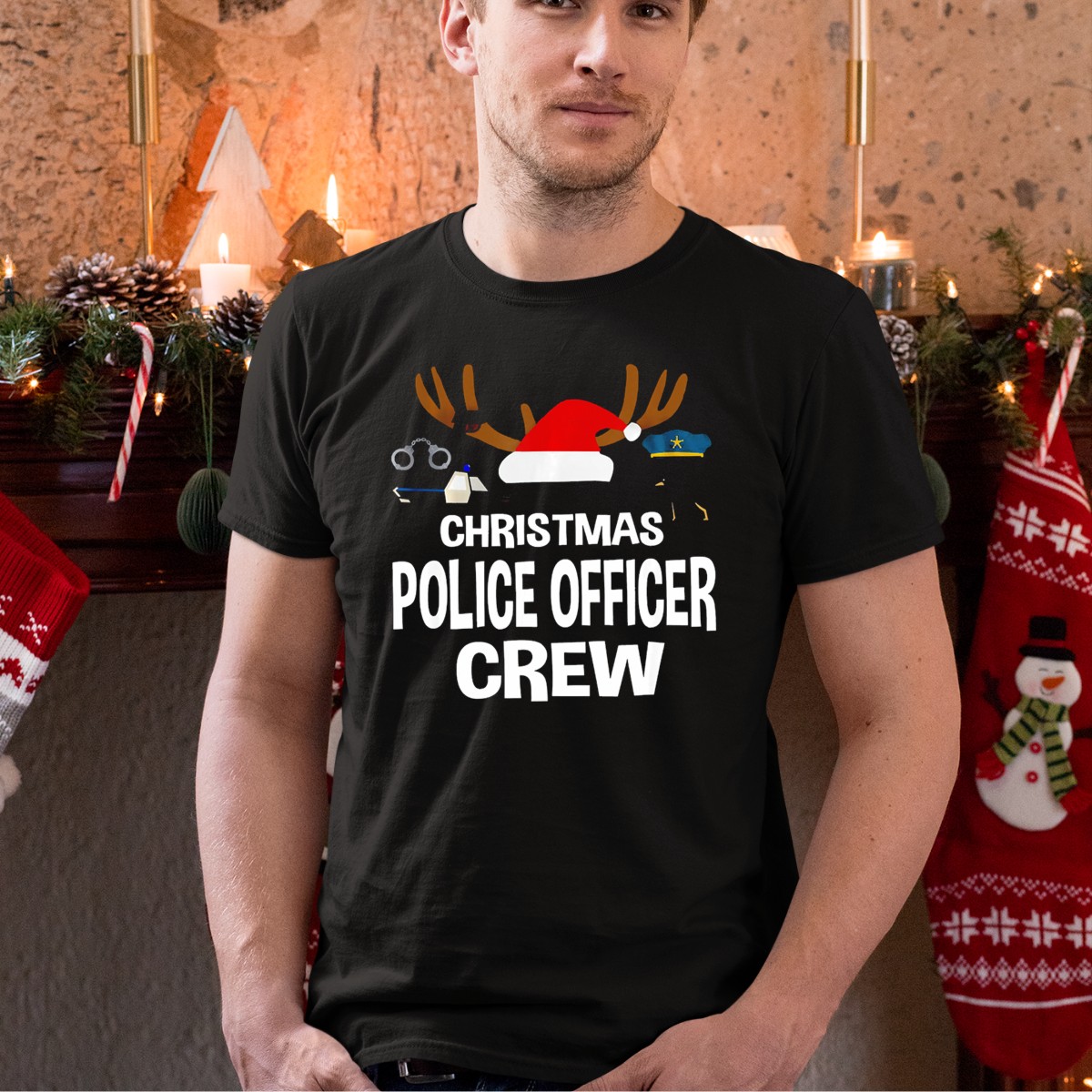 Celebrate the holiday season in style with our Christmas Police Officer Crew Antlers Santa Hat Handcuffs Badge T-Shirt! This festive tee is perfect for law enforcement enthusiasts and those who want to spread holiday cheer at themed events or casual gatherings. Made with a unique fan-made design, it showcases your passion for both the badge and the spirit of Christmas, making it a standout piece for any festive occasion. Printed in the USA, this shirt combines comfort and holiday flair, ensuring you look great while celebrating the season.