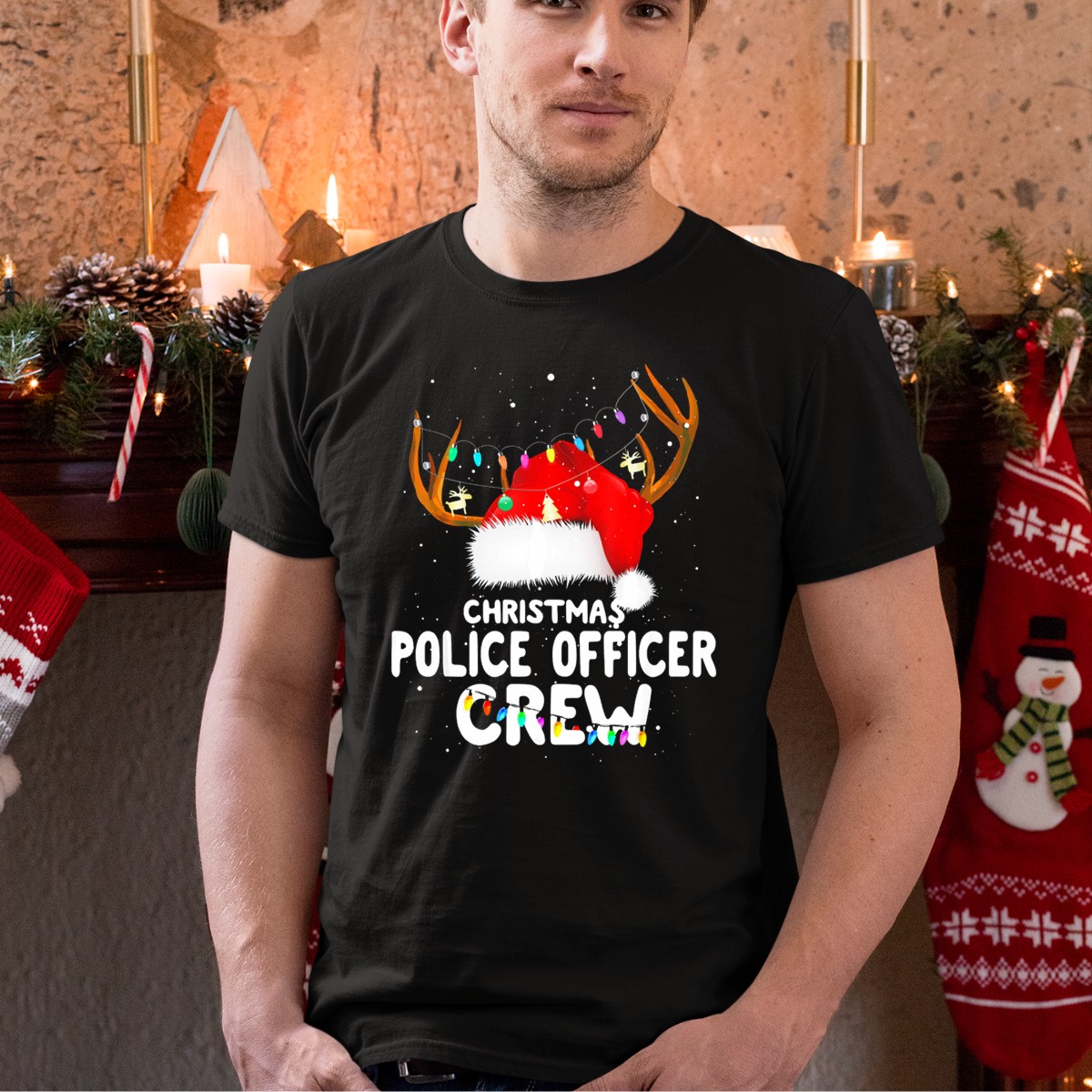 Be the first to review “Christmas Police Officer Crew Santa Hat Lights Antlers T-Shirt”