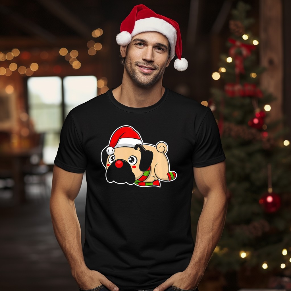 Celebrate the holiday season with our adorable Christmas Pug Puppy T-Shirt, featuring a charming design of a cute pug wearing a festive Santa hat and scarf. Perfect for dog lovers and holiday enthusiasts alike, this shirt adds a playful touch to your casual outfit, making it ideal for family gatherings, themed events, or simply spreading Christmas cheer wherever you go. Made with care in the USA, this fan-made design is sure to become a favorite in your wardrobe.