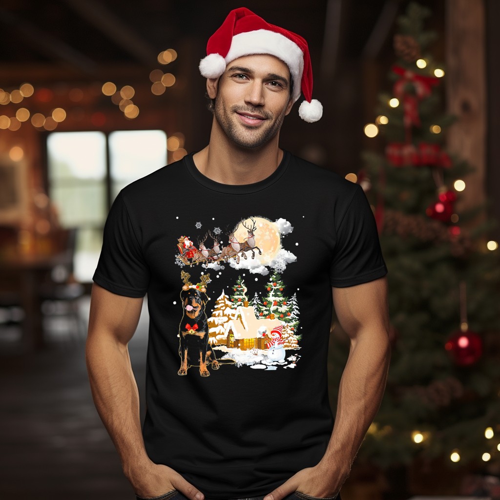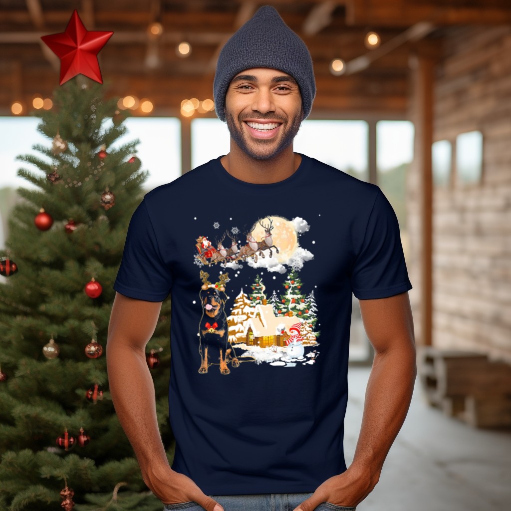 Celebrate the holiday season in style with our Christmas Rottweiler Welcomes Santa Sleigh Under Full Moon T-Shirt! Perfect for dog lovers and festive enthusiasts alike, this shirt features an adorable design that captures the joy of Christmas through the eyes of a playful Rottweiler. Ideal for casual wear, themed events, or simply spreading cheer during daily outings, this unique fan-made graphic is sure to turn heads and spark conversations wherever you go.