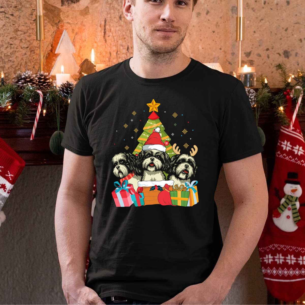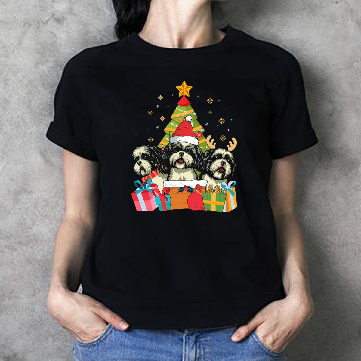 Celebrate the holiday season in style with our Christmas Shih Tzu Dogs With Santa Hat And Antlers T-Shirt! Perfect for dog lovers and festive spirits alike, this whimsical design adds a touch of fun to your casual wear. Ideal for themed events, family gatherings, or simply spreading cheer during your daily outings, this shirt is a must-have for anyone looking to show off their love for these adorable pups while enjoying the comfort of a classic fit.