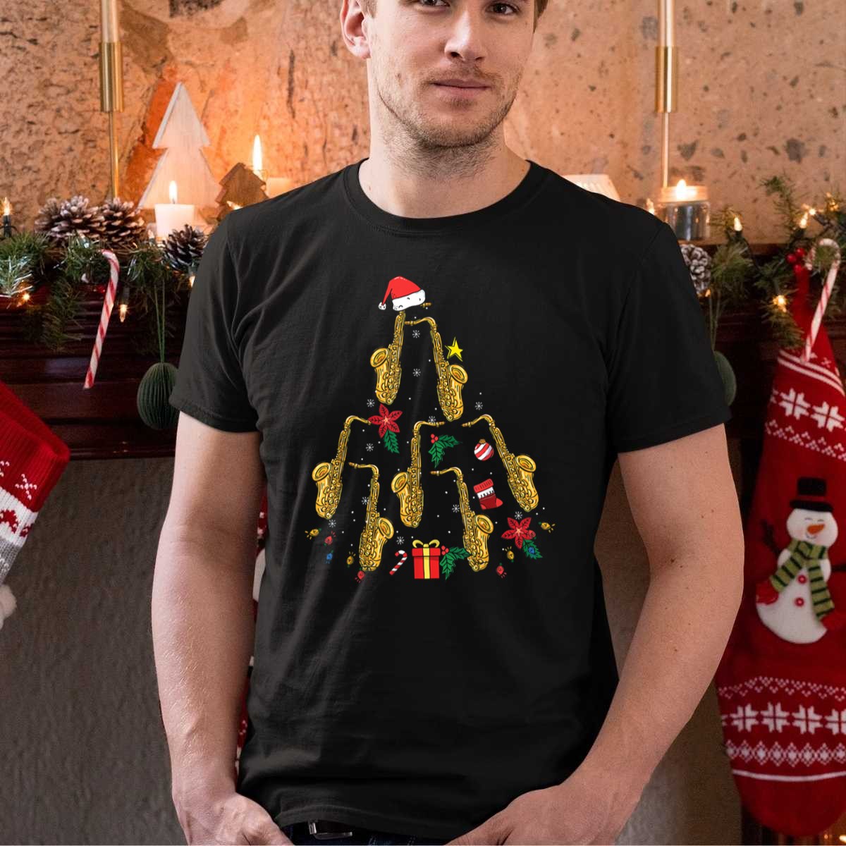 Celebrate the festive spirit with our unique Christmas Tree Made Of Saxophones T-Shirt, perfect for music lovers and holiday enthusiasts alike. This fan-made design features a whimsical saxophone tree adorned with a Santa hat and cheerful holiday decorations, making it an ideal choice for casual gatherings, themed events, or simply to spread some joy during the holiday season. Crafted for comfort, this shirt is sure to become a favorite in your all-season wardrobe.