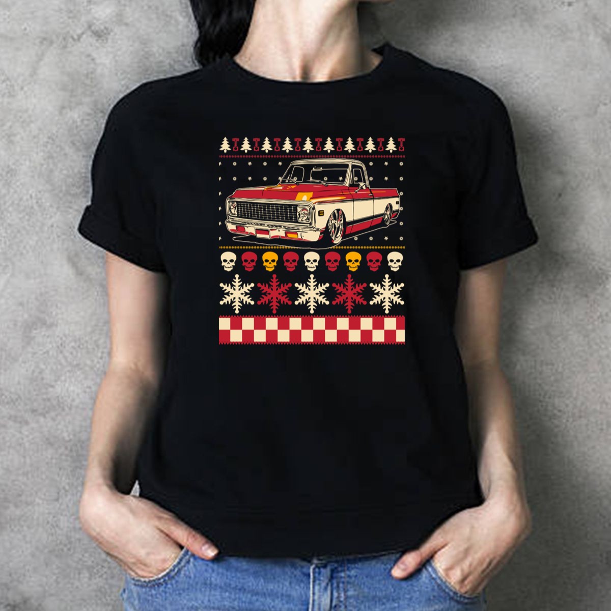 Embrace the holiday spirit with our Classic Antique Pickup Truck Ugly Christmas Sweater T-shirt, featuring a unique design of skulls, snowflakes, and trees that’s perfect for those who love to stand out during festive gatherings. This fan-made graphic T-shirt is ideal for casual wear, themed events, or just daily lounging, making it a must-have for anyone looking to add a touch of quirky charm to their wardrobe. Printed in the USA, it combines comfort and style effortlessly.
