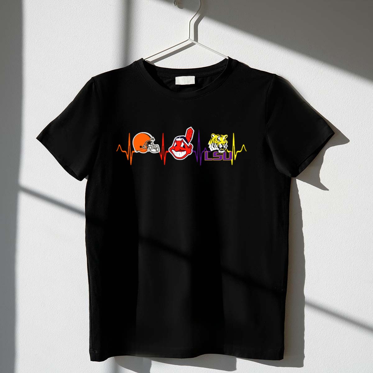 Show your unwavering support for your favorite teams with the Cleveland Browns Indians LSU Tigers Heartbeat Line T-Shirt. This fan-made design captures the spirit of sports camaraderie, making it perfect for game days, casual outings, or themed events. Crafted for comfort and style, this shirt is a must-have for any devoted fan looking to showcase their pride in a unique way.