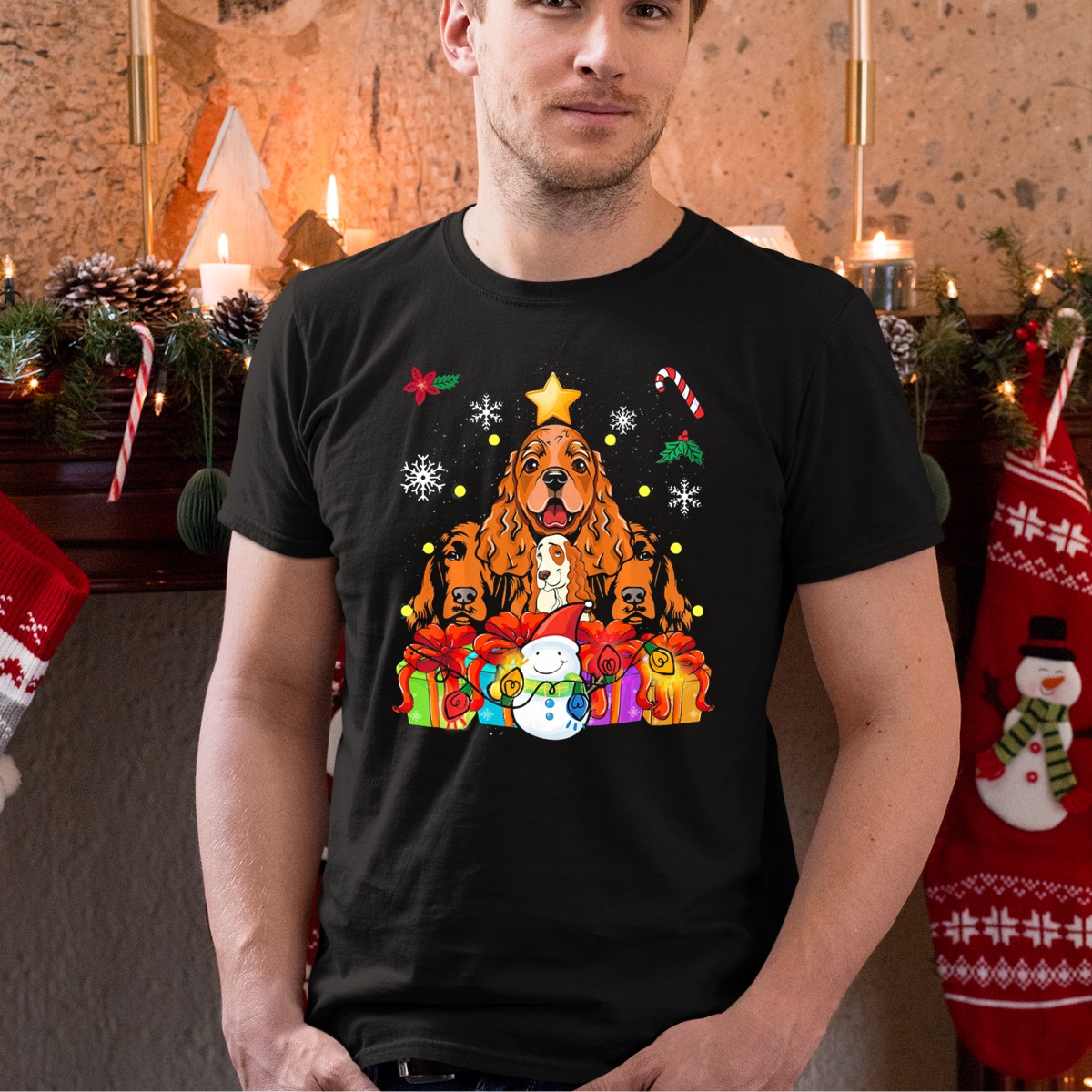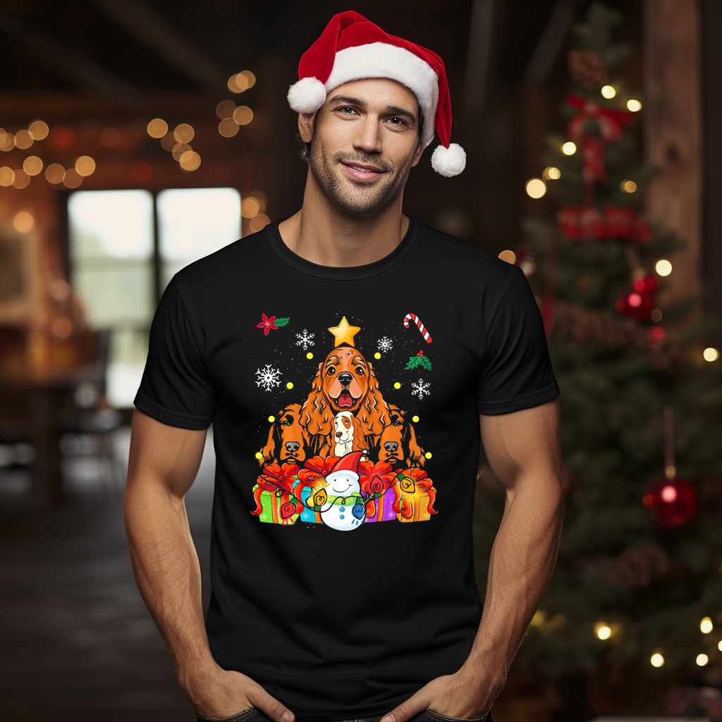 Be the first to review “Cocker Spaniel Christmas Tree Star Santa Snowman Presents Candy Cane Snowflakes T-Shirt”