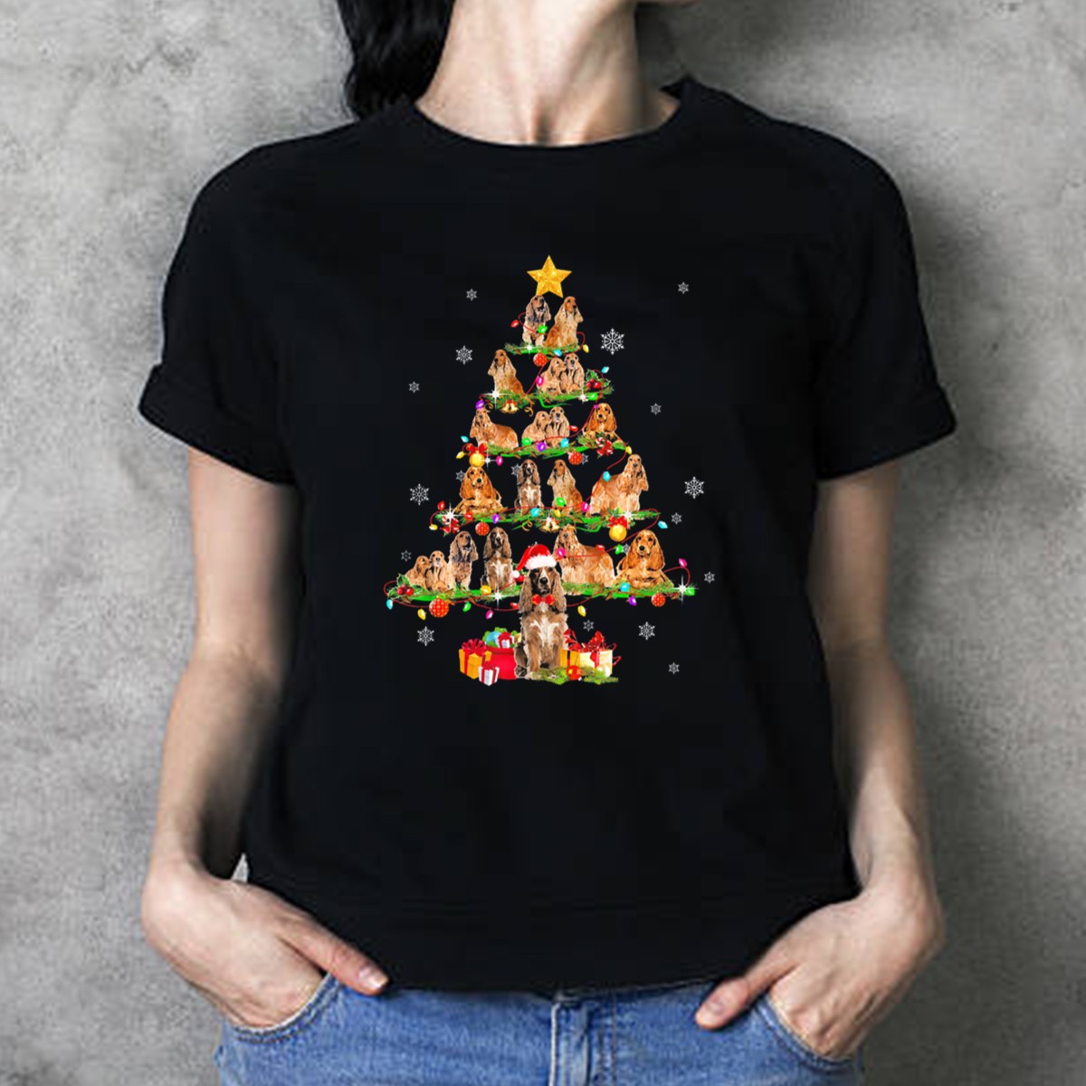 Celebrate the holiday season with our Cocker Spaniel Christmas Tree T-Shirt, a delightful blend of festive cheer and canine love. Perfect for dog lovers and holiday enthusiasts alike, this shirt showcases a charming design featuring a Cocker Spaniel adorned with a Santa hat, surrounded by twinkling lights on a beautifully decorated Christmas tree. Whether you’re attending a themed event, enjoying a casual day out, or simply spreading holiday joy, this unique fan-made design will surely make you the center of attention. Proudly printed in the USA, it’s a must-have for anyone looking to add a touch of festive fun to their wardrobe.