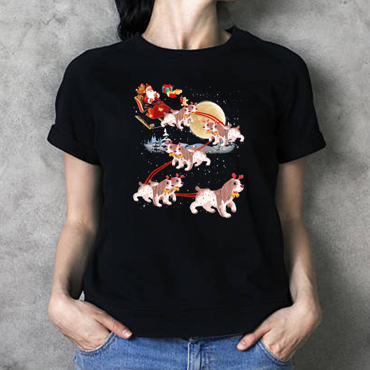 Celebrate the holiday spirit with our Cocker Spaniel Reindeer Santa Sleigh Christmas Moon Scene T-Shirt! Perfect for dog lovers and festive enthusiasts alike, this shirt combines a whimsical design featuring a Cocker Spaniel in a cheerful Christmas scene. Whether you’re attending a themed event, holiday party, or simply spreading cheer during daily wear, this unique fan-made design is sure to bring smiles and joy wherever you go.