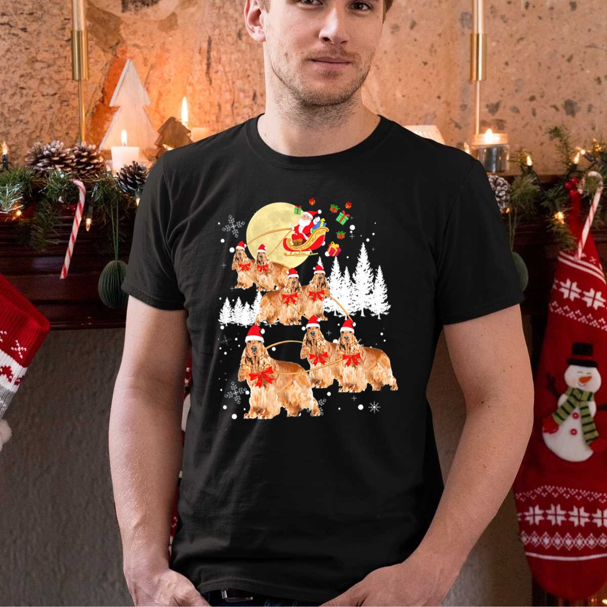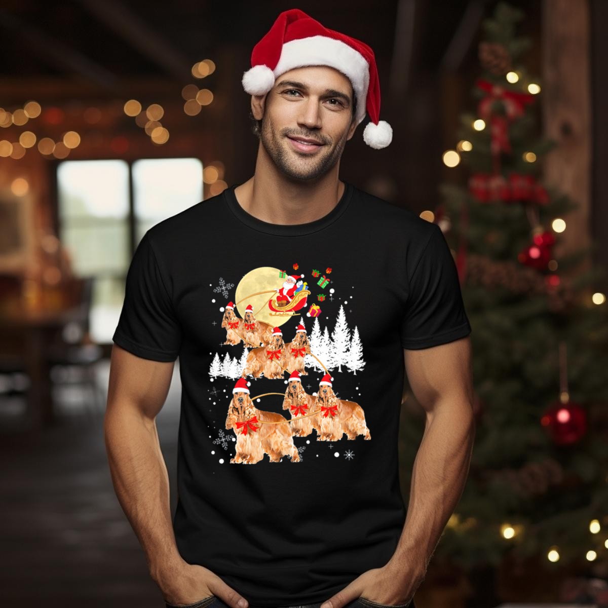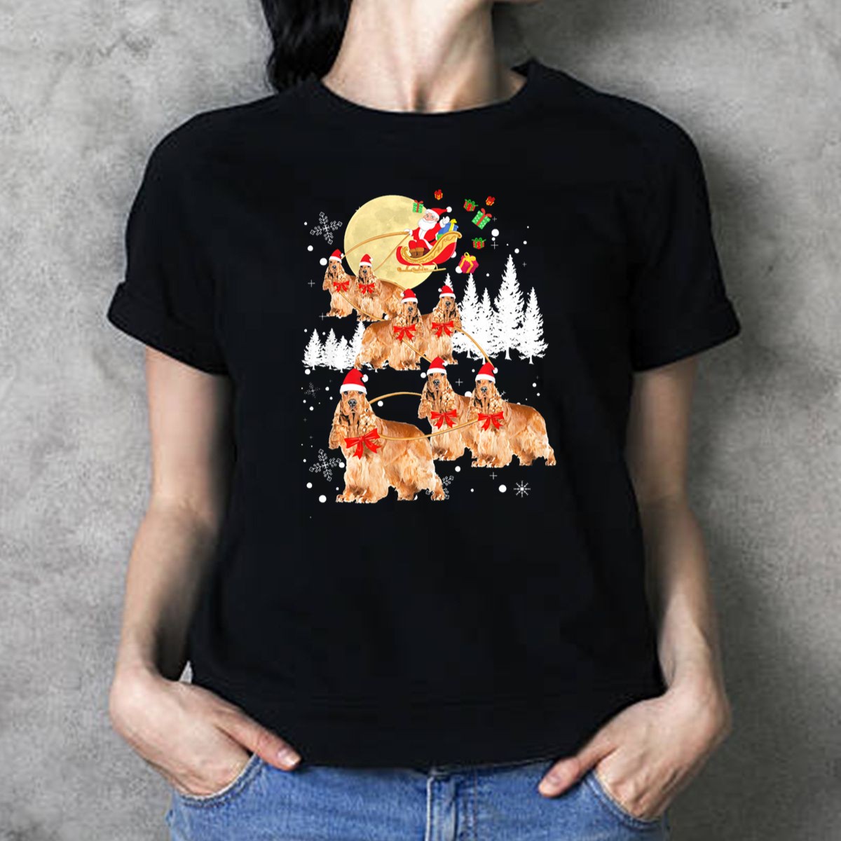 Celebrate the holiday spirit with our Cocker Spaniel Santas Reindeer Christmas Sleigh Snowflakes T-Shirt! Perfect for dog lovers and festive enthusiasts alike, this fun and whimsical design brings joy to casual gatherings, themed events, or simply adding a touch of cheer to your daily wear. Made for comfort and style, it’s ideal for any occasion during the festive season and beyond, making it a unique addition to your wardrobe.