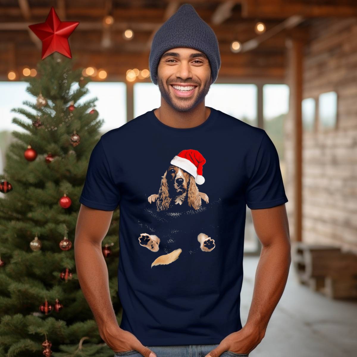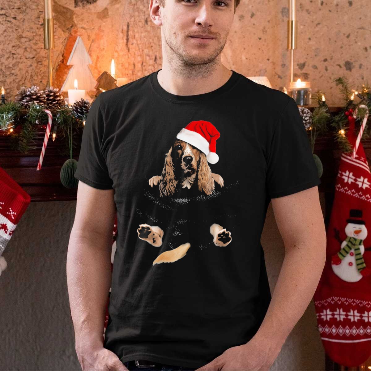 Celebrate the festive season with our charming Cocker Spaniel Wearing Santa Hat In Christmas Pocket T-Shirt! This delightful design is perfect for dog lovers and holiday enthusiasts alike, making it an ideal choice for casual outings, themed events, or just cozying up at home. Made with a fan-made design printed in the USA, this shirt combines comfort and style to spread holiday cheer wherever you go!