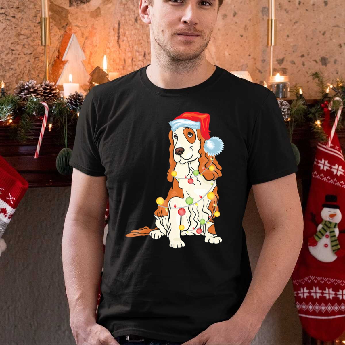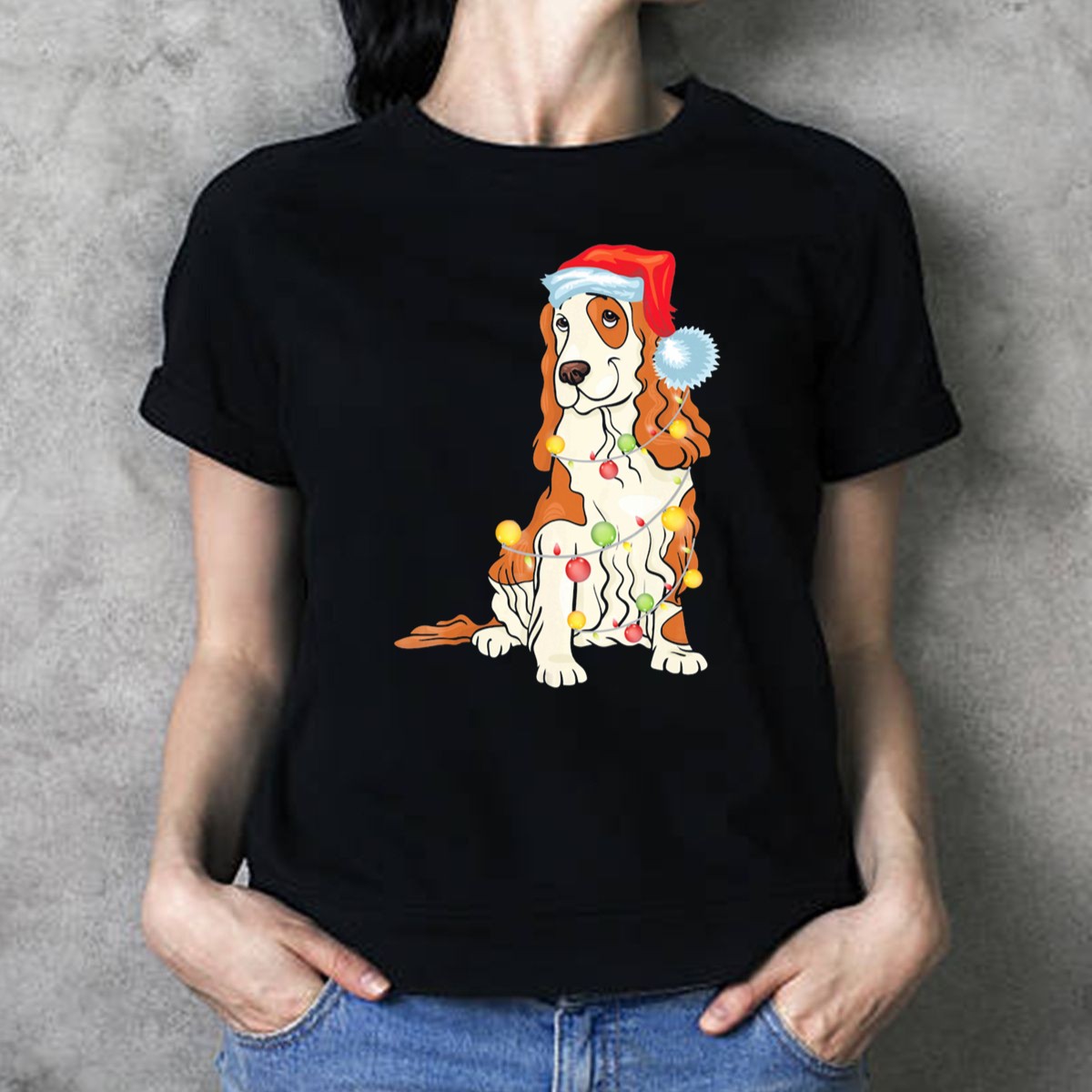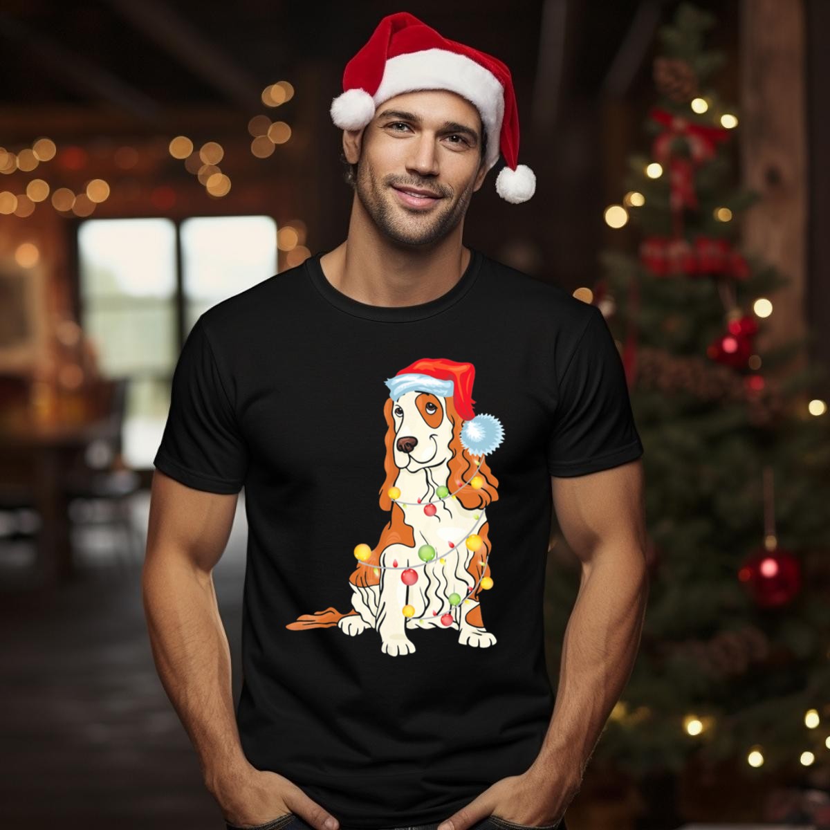 Celebrate the festive spirit with our Cocker Spaniel Wearing Santa Hat T-Shirt, perfect for dog lovers and holiday enthusiasts alike! This charming design, featuring an adorable Cocker Spaniel adorned with a Santa hat and surrounded by vibrant Christmas lights, makes it an ideal choice for casual wear during the holiday season, themed events, or simply brightening up your daily attire. Crafted with love and printed in the USA, this fan-made masterpiece is sure to bring joy and smiles wherever you go.