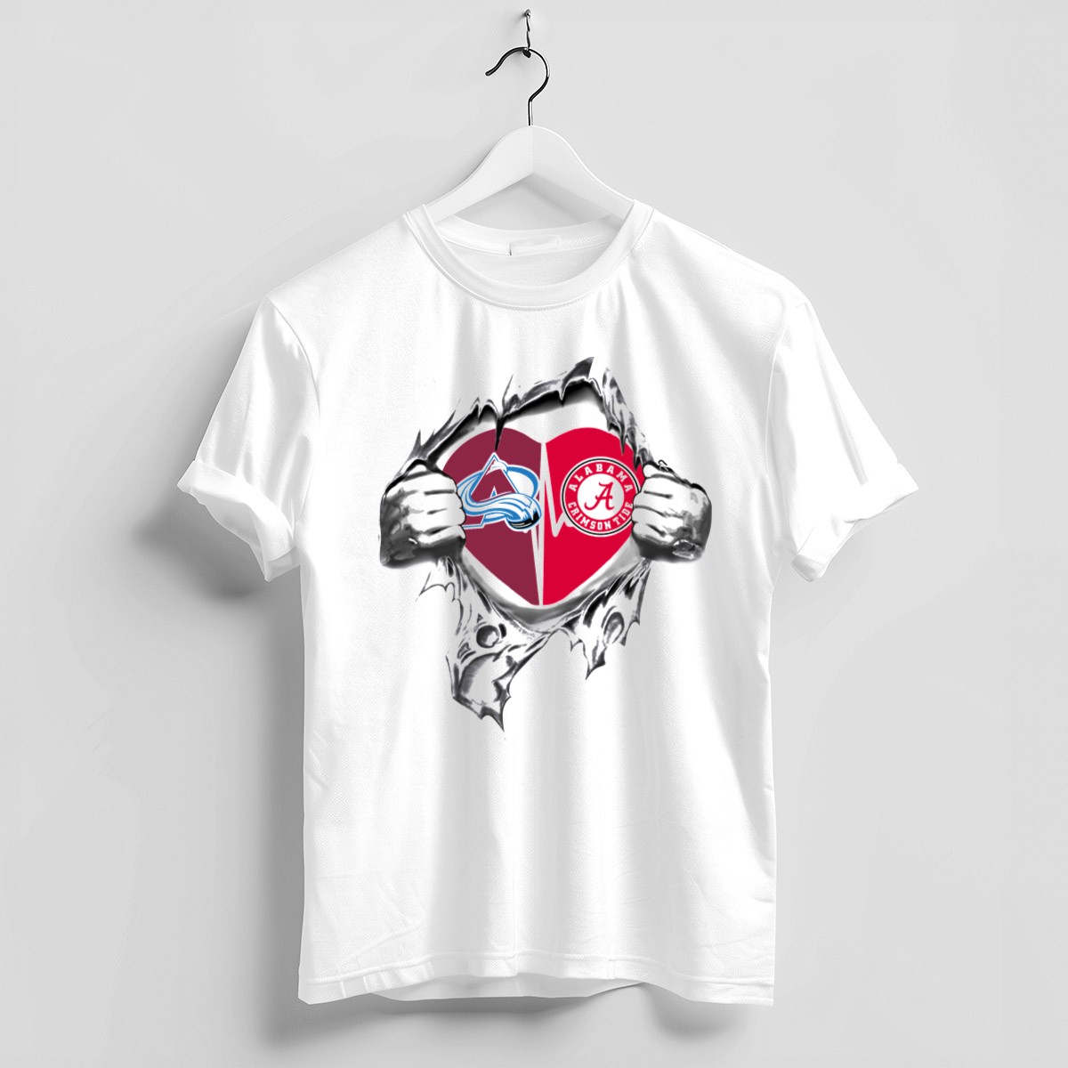 Show your unwavering support for your favorite teams with the Colorado Avalanche Alabama Crimson Tide Heart Tear T-Shirt! This fan-made design is perfect for sports enthusiasts who want to showcase their passion in a stylish and comfortable way. Ideal for casual outings, themed events, or just everyday wear, this shirt combines the love for both teams in a unique and eye-catching print. Made in the USA, this T-shirt is not just a piece of clothing; it’s a statement of loyalty!