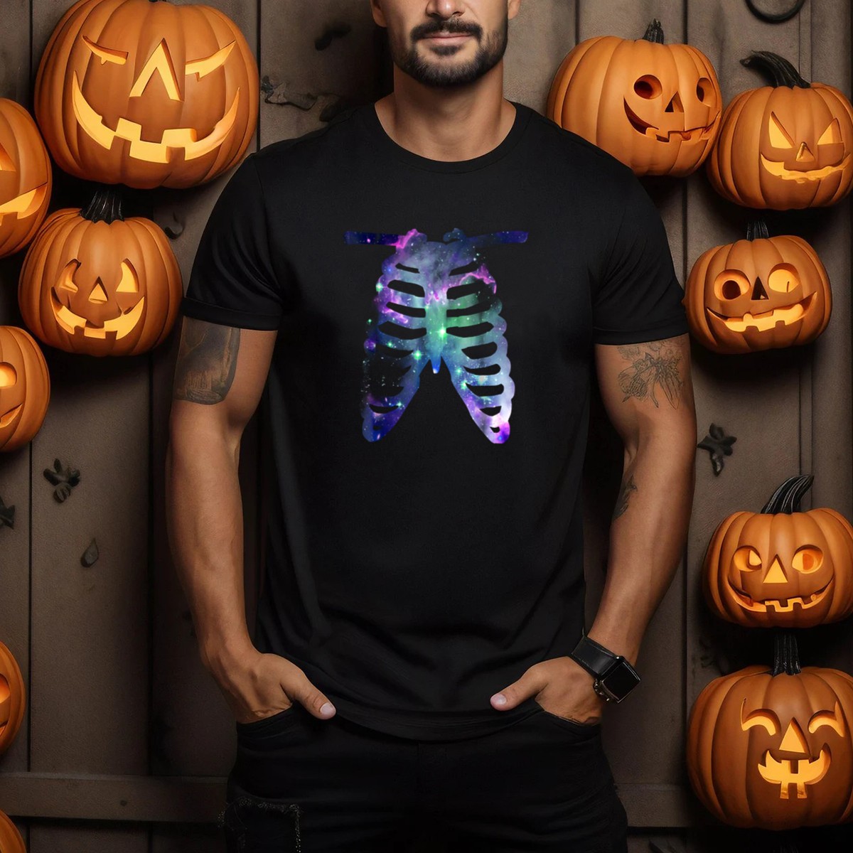 Unleash your cosmic spirit this Halloween with our Cosmic Galaxy Ribcage T-Shirt! Perfect for those who love to stand out at themed events or make a statement during daily wear, this fan-made design features a stunning graphic of skeleton ribs set against a vibrant galaxy backdrop. Crafted for comfort and style, this unique tee is ideal for anyone looking to add a touch of the extraordinary to their casual wardrobe.