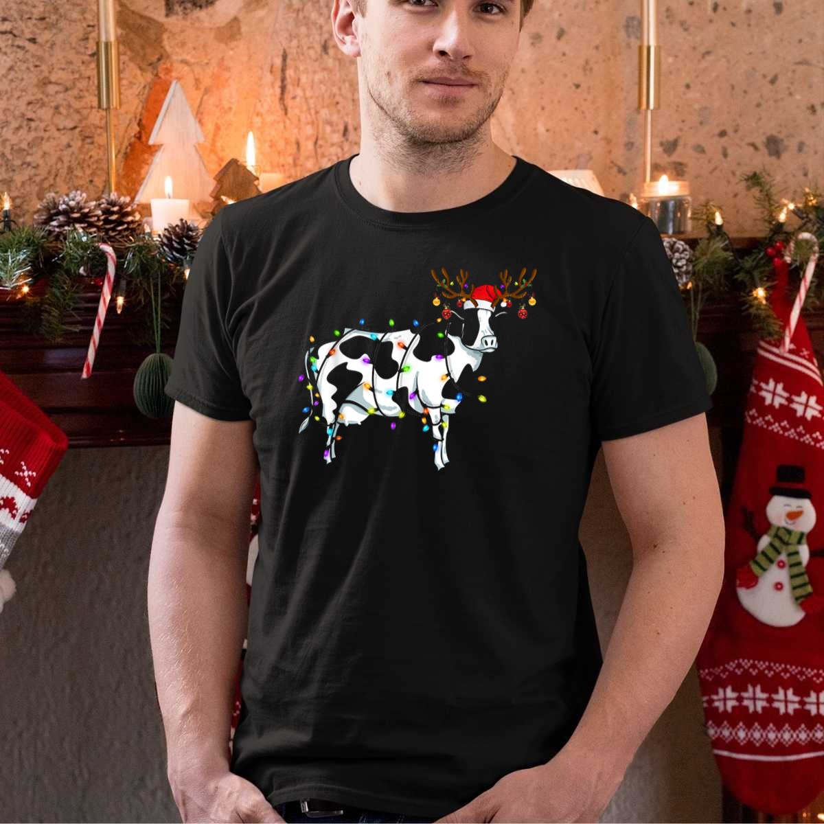 Cow With Christmas Lights And Reindeer Antlers Santa Hat T Shirt