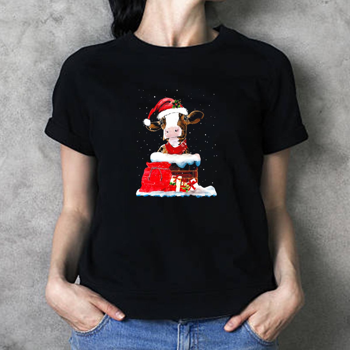 Cow With Santa Hat In Chimney And Christmas Gifts T Shirt