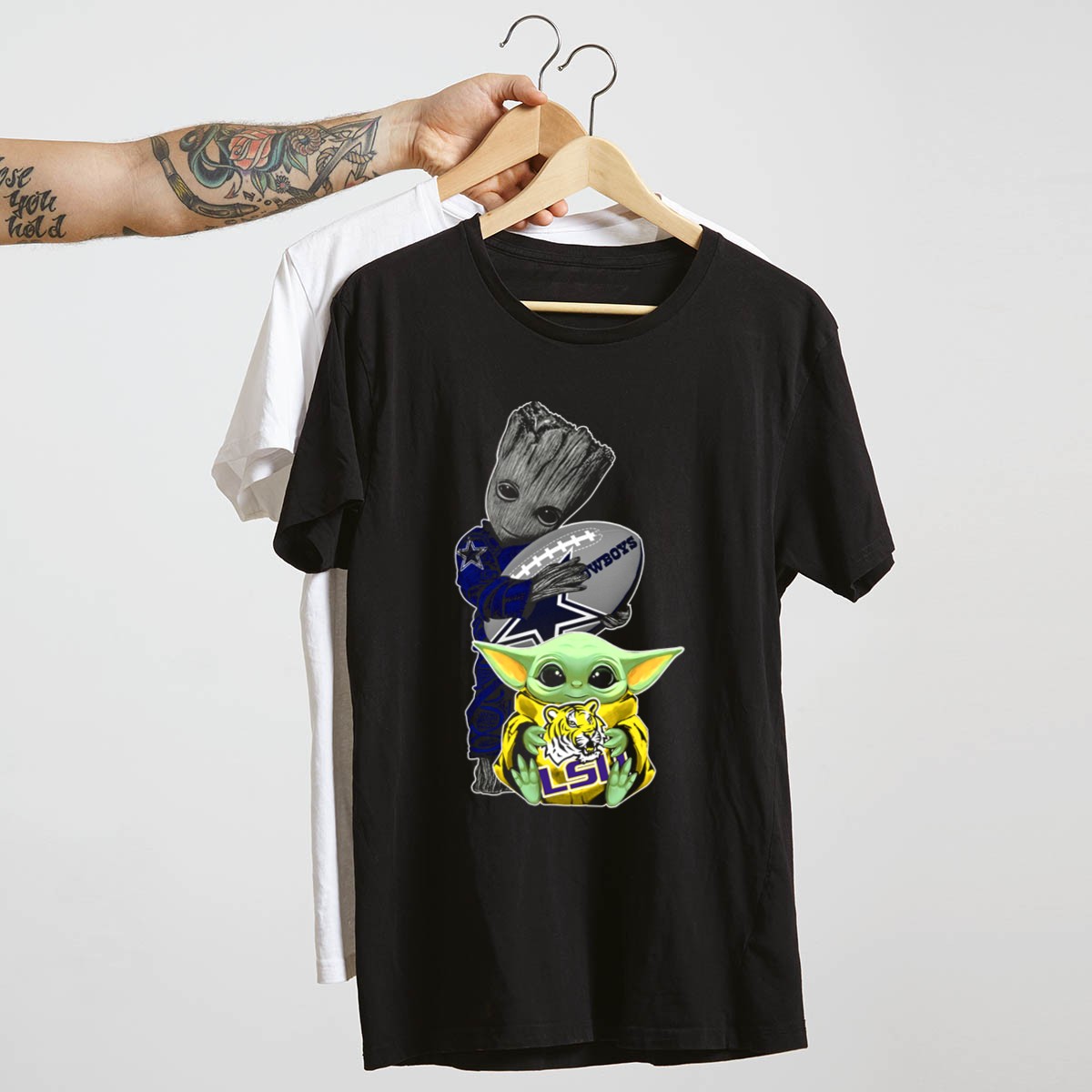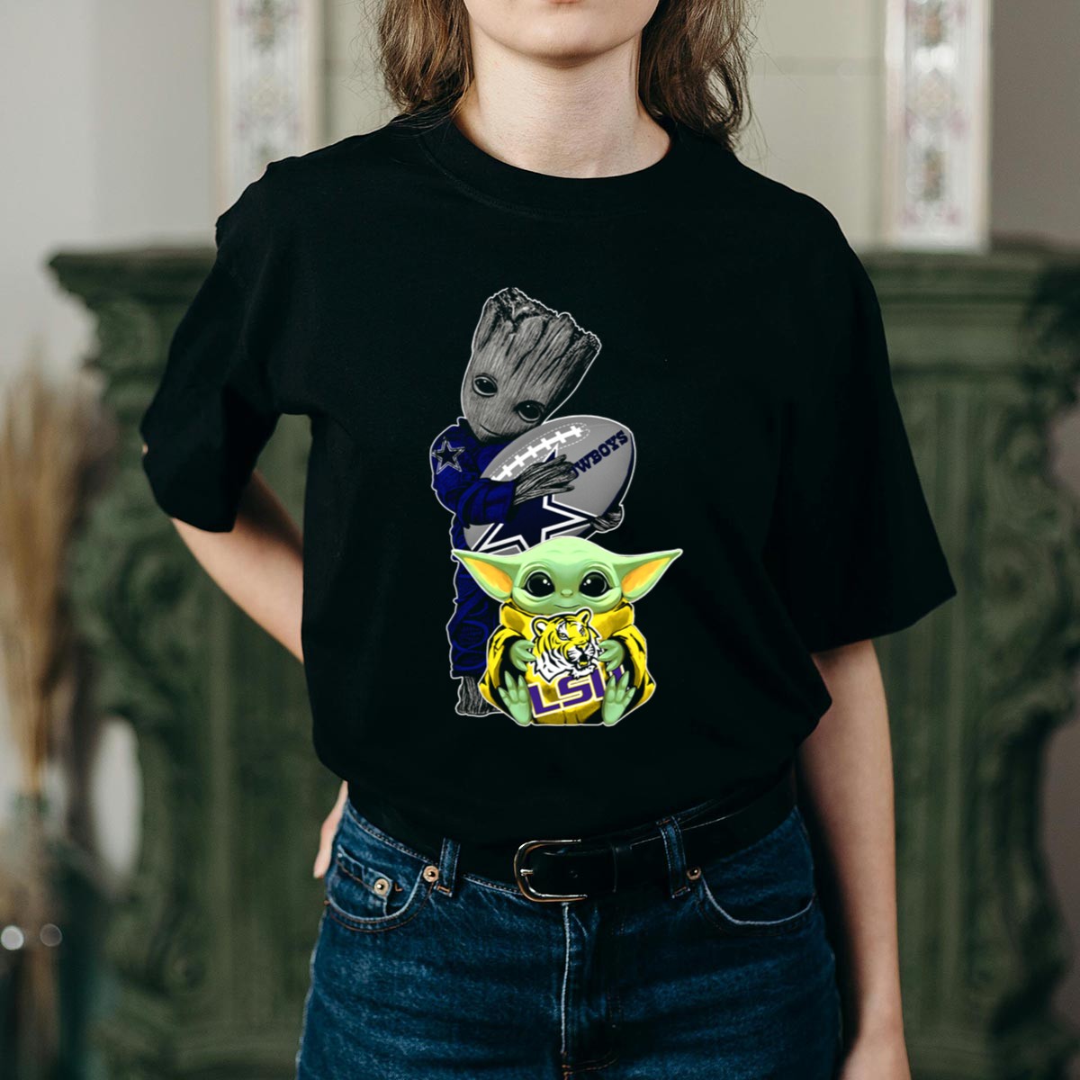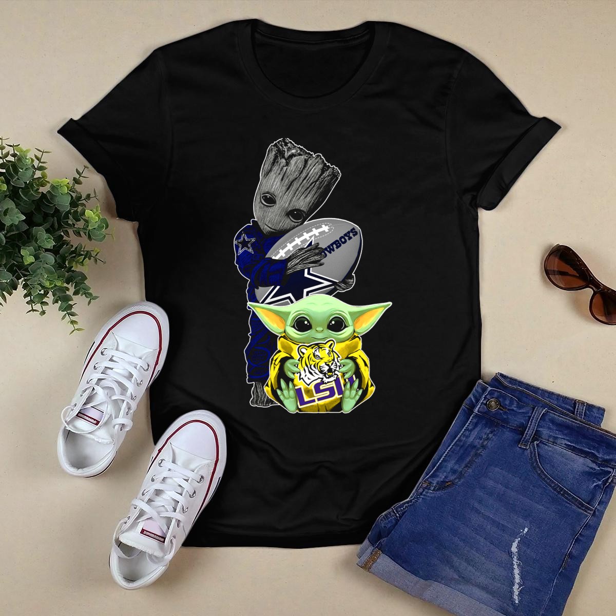Show off your team spirit with our Cowboys Football Groot And LSU Yoda T-Shirt! This fan-made design is perfect for passionate sports enthusiasts and casual fans alike. Ideal for game days, themed events, or simply lounging around, this shirt brings together the love for football and beloved pop culture characters in a unique way. Made for comfort and style, it’s your go-to choice for any occasion, showcasing your love for both the Cowboys and LSU Tigers!