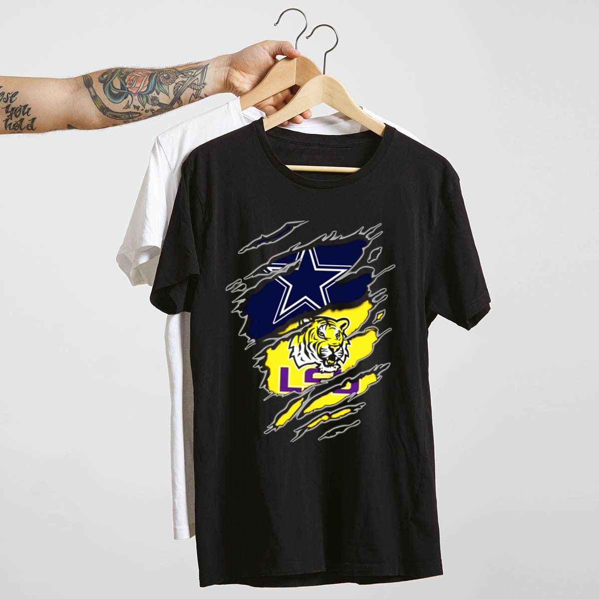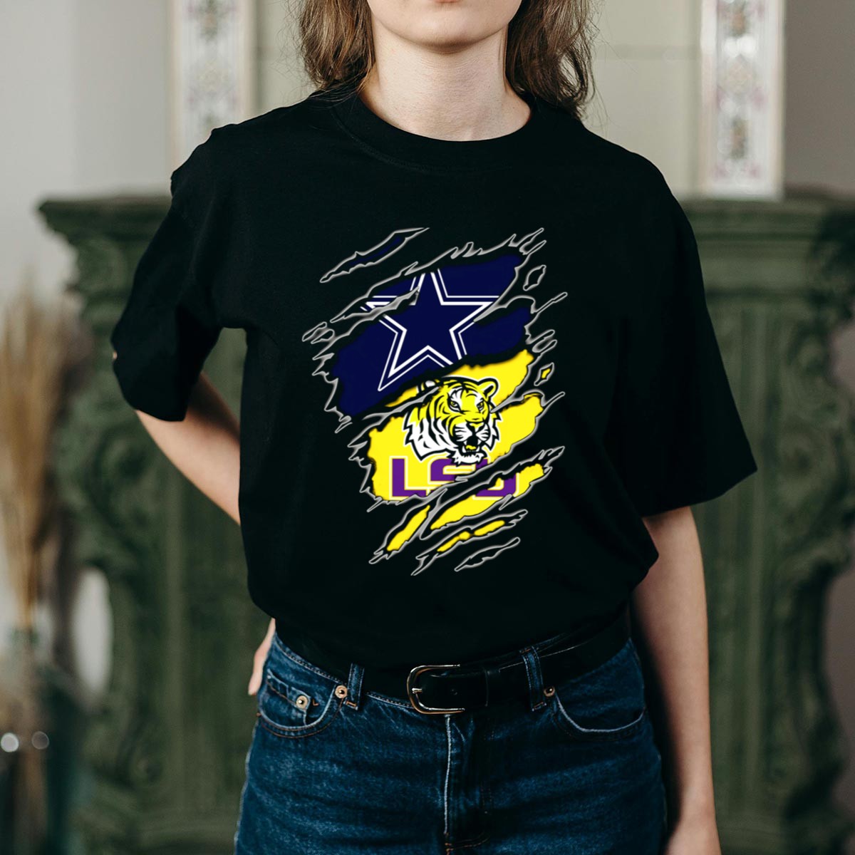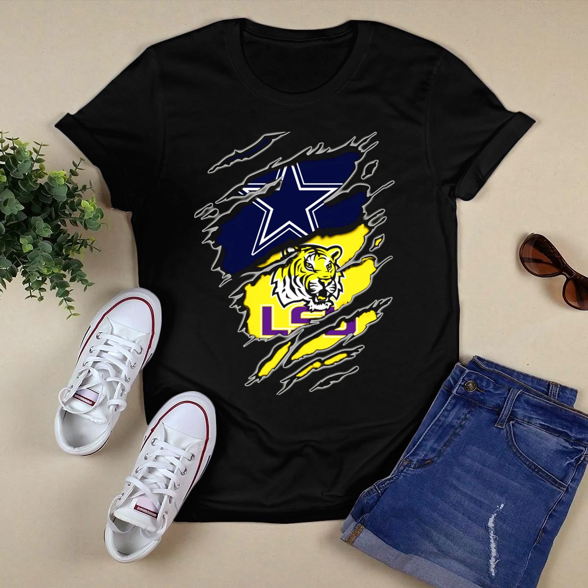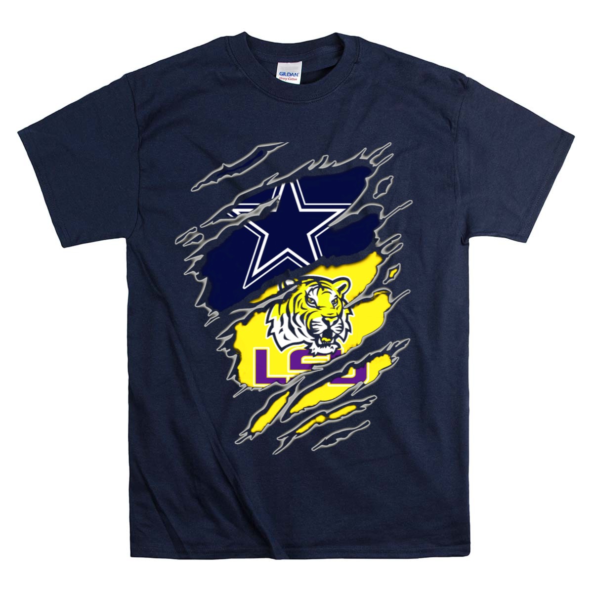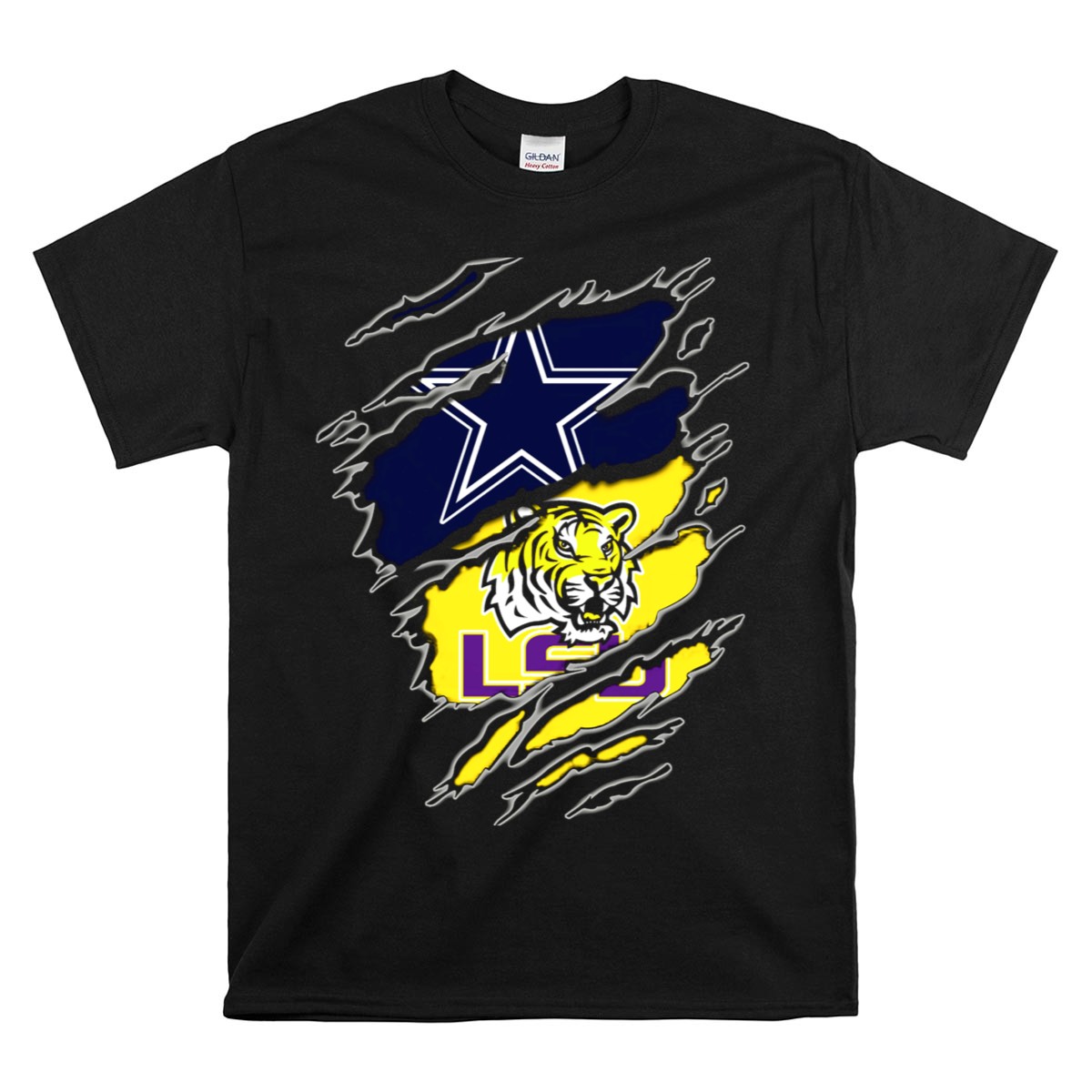 Show your team spirit with the Cowboys Star and LSU Tiger Claw Marks T-Shirt, the perfect choice for fans who want to express their passion for their favorite teams. Crafted for comfort and style, this fan-made design is printed in the USA, making it a unique addition to your casual wardrobe. Whether you’re heading to a game, attending a themed event, or just enjoying a day out, this shirt is an ideal choice for all occasions.