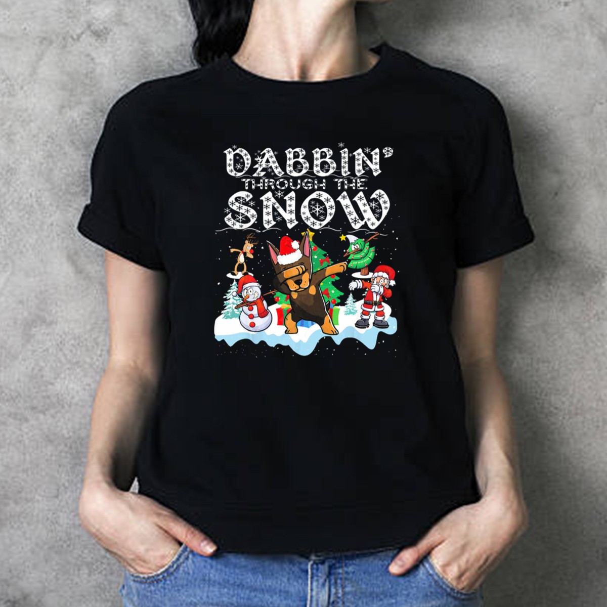 Be the first to review “Dabbin’ Through The Snow Christmas Doberman Santa And Snowman Fun T-Shirt”