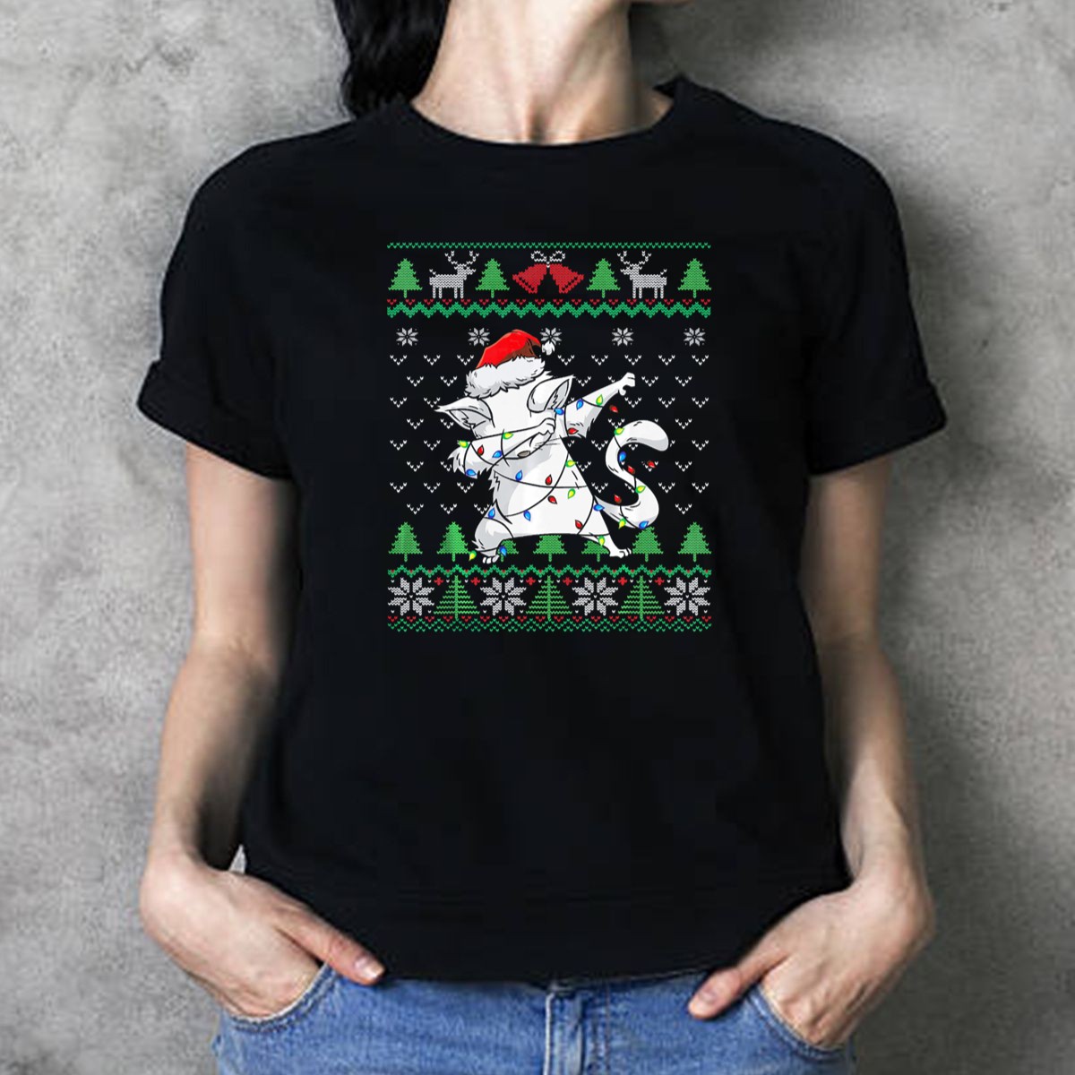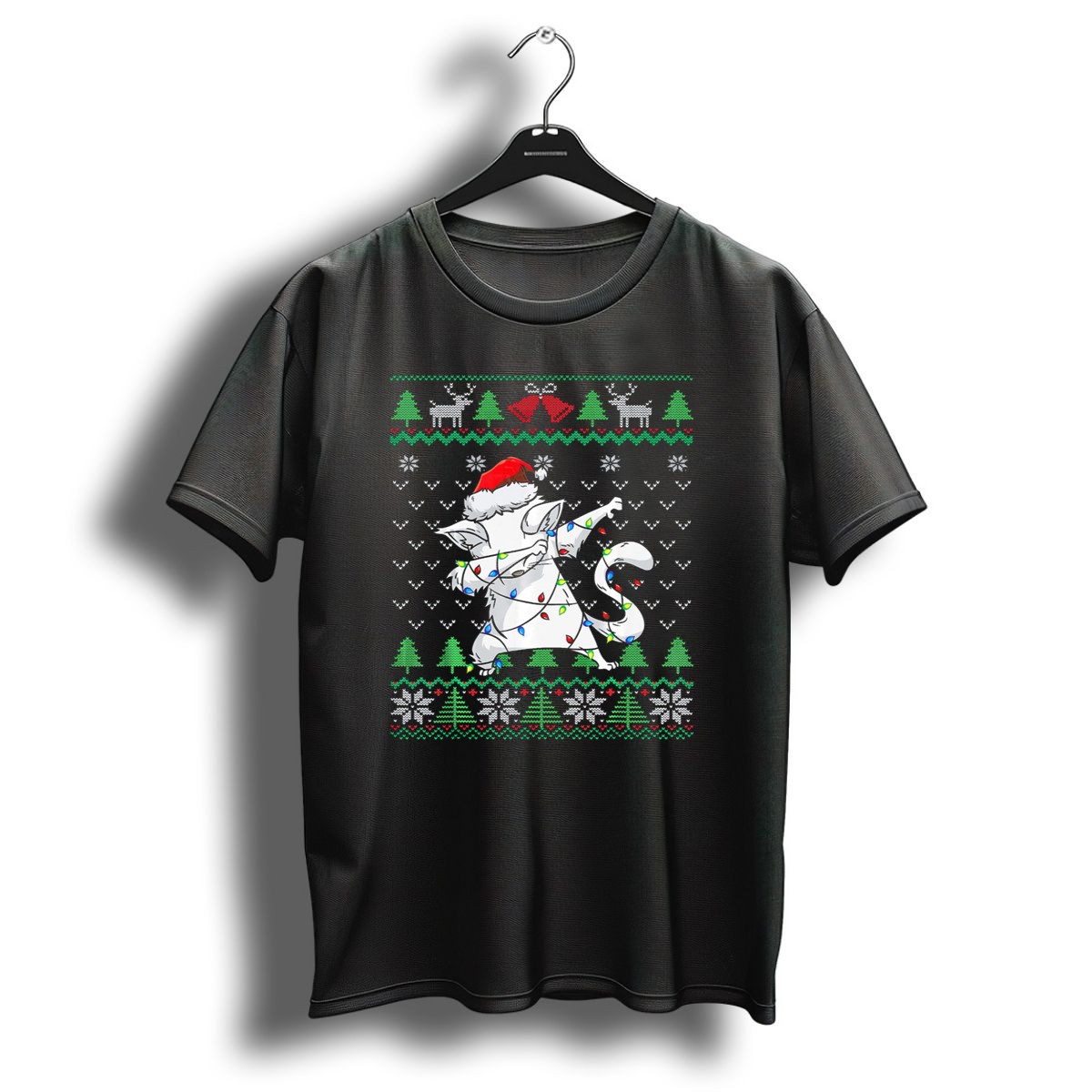 Celebrate the holiday season with our Dabbing Cat Santa Hat Christmas Lights Ugly Sweater Kitten T-Shirt! Perfect for cat lovers and holiday enthusiasts alike, this playful design brings a fun twist to your festive wardrobe. Ideal for casual outings, themed events, or simply lounging at home, this shirt is sure to be a conversation starter at any gathering. Made with a fan-made design printed in the USA, it combines humor and holiday spirit, making it a unique addition to your collection.