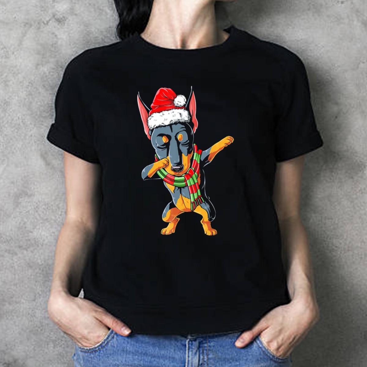 Get ready to spread some holiday cheer with our Dabbing Doberman Santa In Christmas Scarf T-Shirt! Perfect for dog lovers and festive spirit enthusiasts alike, this fun and playful design showcases a dabbing Doberman dressed as Santa, complete with a jolly scarf. Ideal for casual wear, themed events, or simply to brighten your day during the holiday season, this shirt is sure to make you the center of attention at any gathering. Made with love and printed in the USA, this fan-made design combines comfort and style for every dog lover!