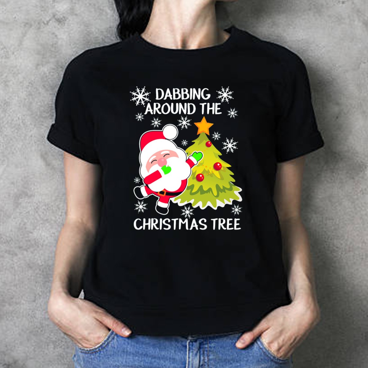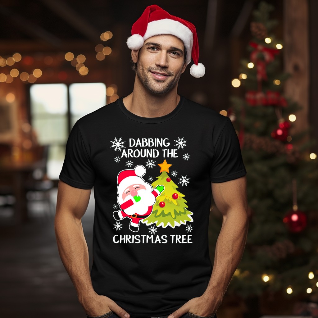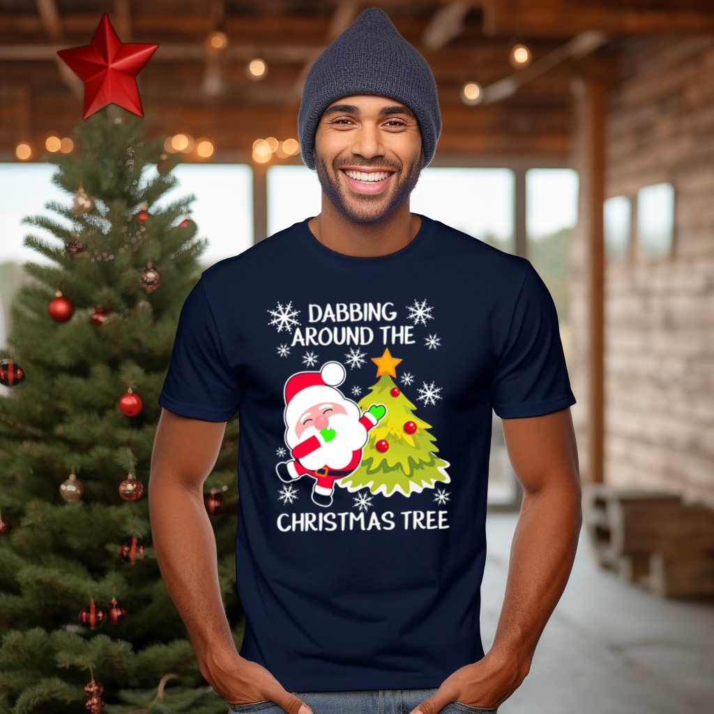 Get into the holiday spirit with our Dabbing Santa Claus Around The Christmas Tree T-Shirt! This playful and festive design features Santa busting a move next to a beautifully adorned Christmas tree, making it a perfect choice for anyone looking to spread cheer during the holiday season. Ideal for casual gatherings, themed events, or daily wear, this fan-made shirt is printed in the USA and is sure to bring smiles to family and friends alike.