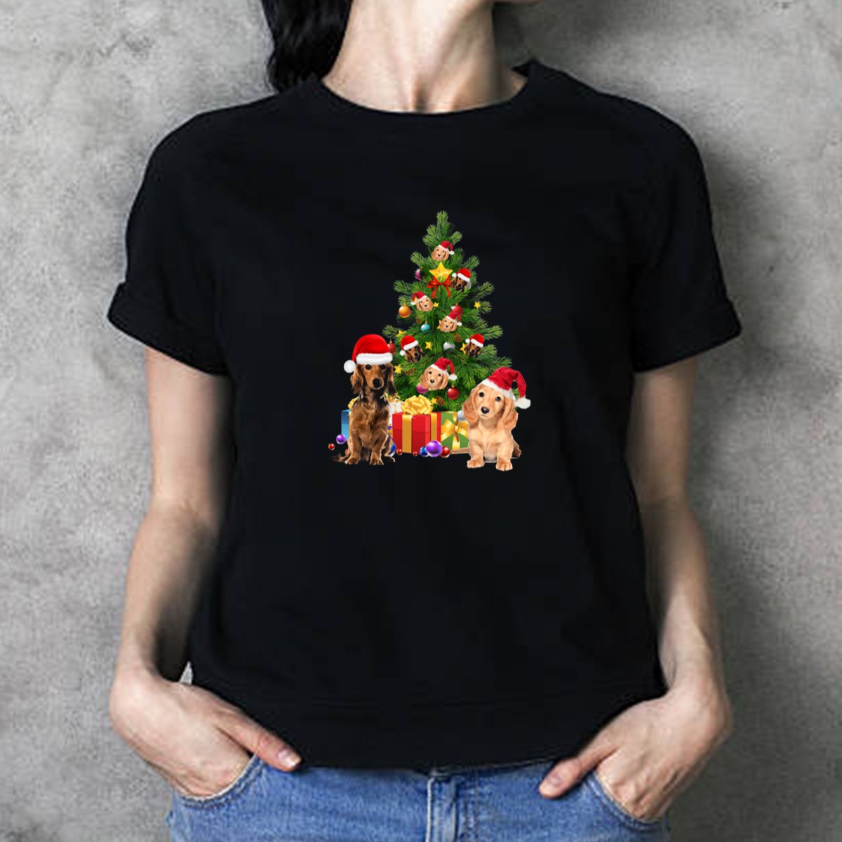 Be the first to review “Dachshund Christmas Tree With Santa Hat Puppies And Festive Gifts T Shirt”